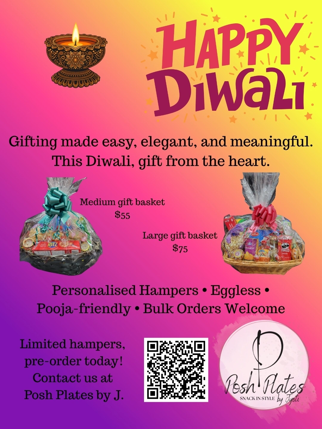 Get ready for Diwali with these beautiful gift baskets from Posh Plates by J! Choose from a medium gift basket for $55 or a large gift basket for $75. Perfect for gifting this Diwali!