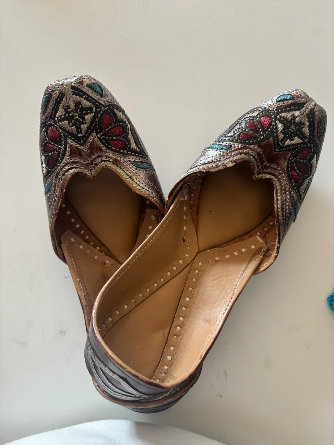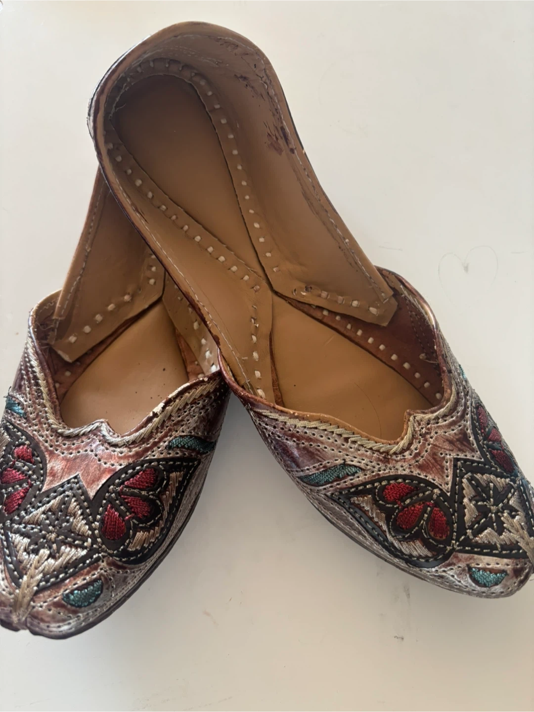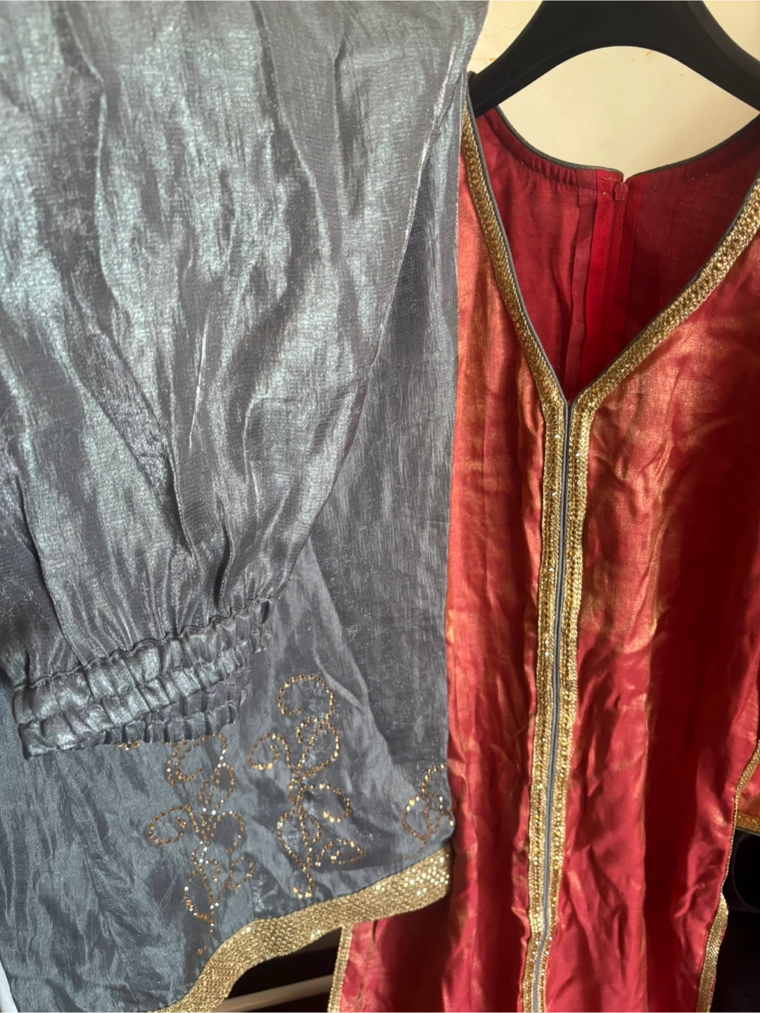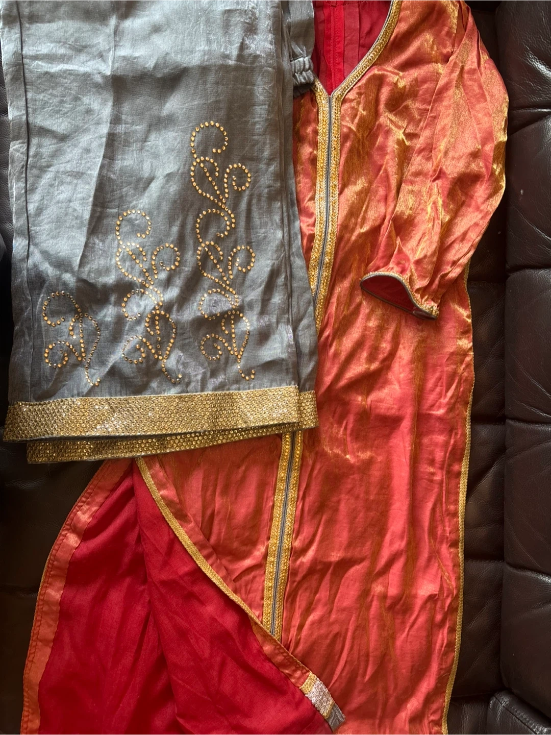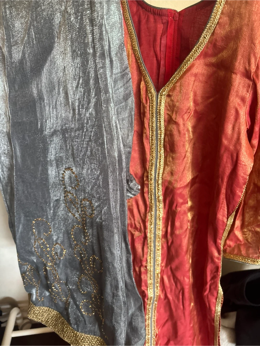 Beautiful Shalwar Kameez suit in excellent condition! The top is a vibrant red and gold colour, and the pants are a stylish grey with gold detailing. Perfect for a special occasion or everyday wear. Bonus with Indian traditional shoes.