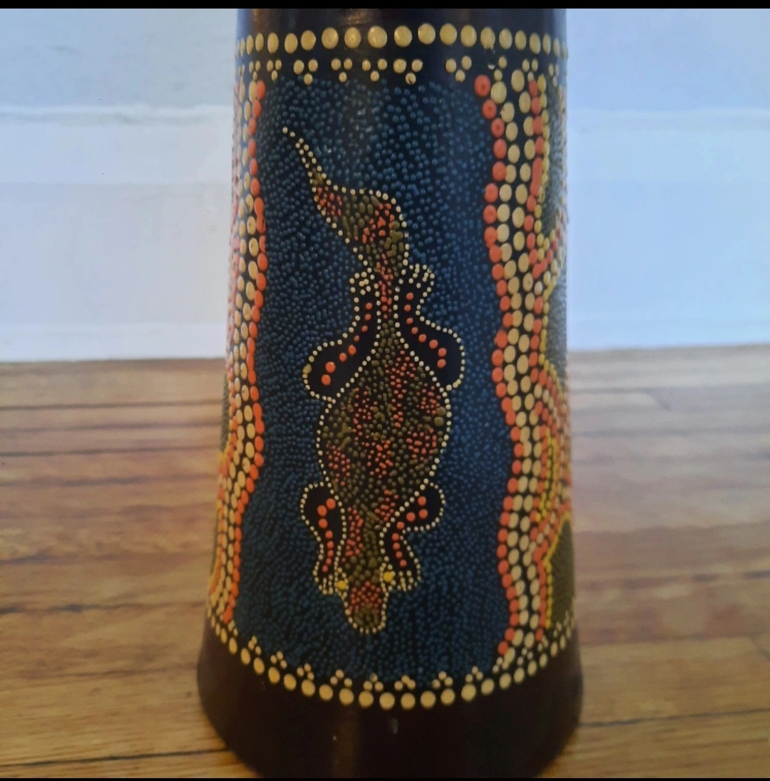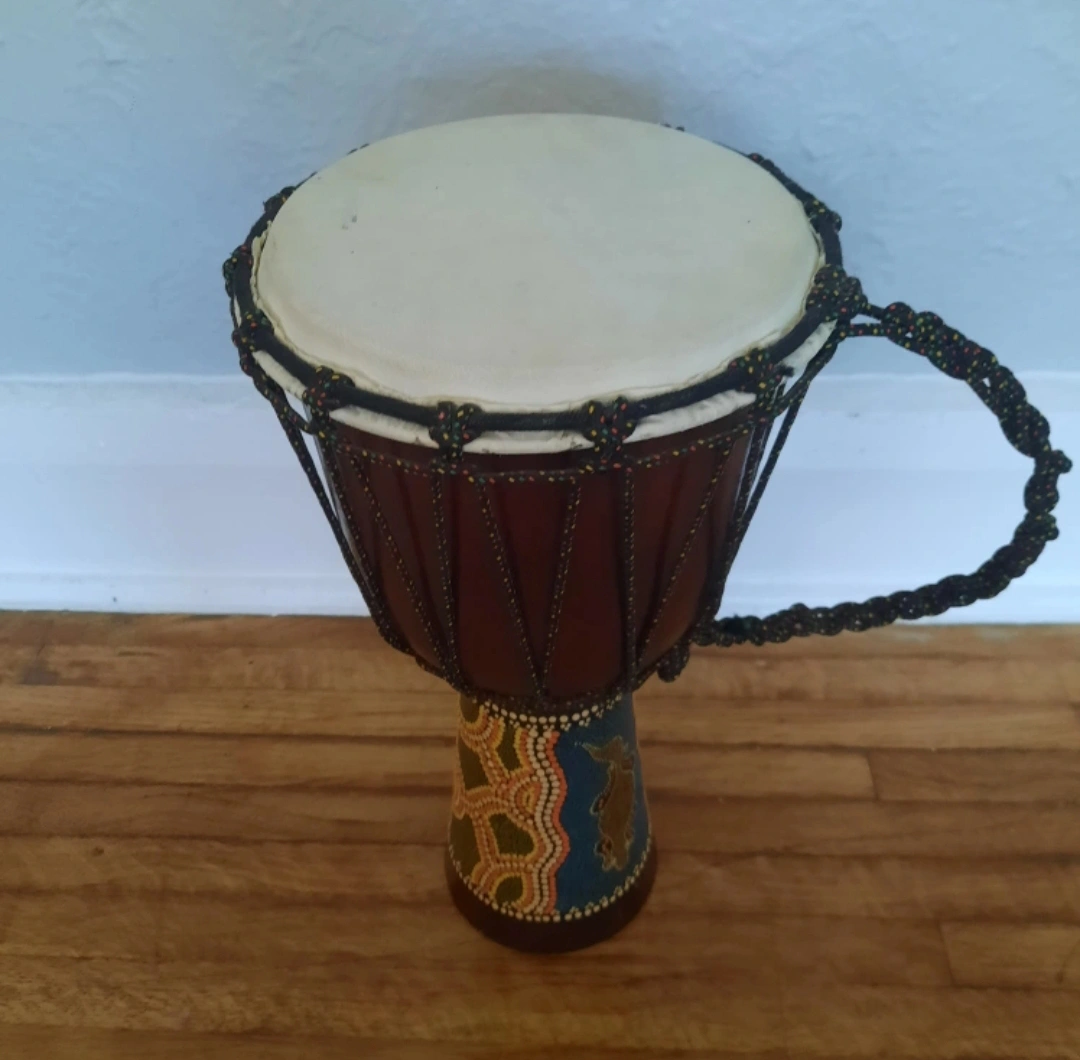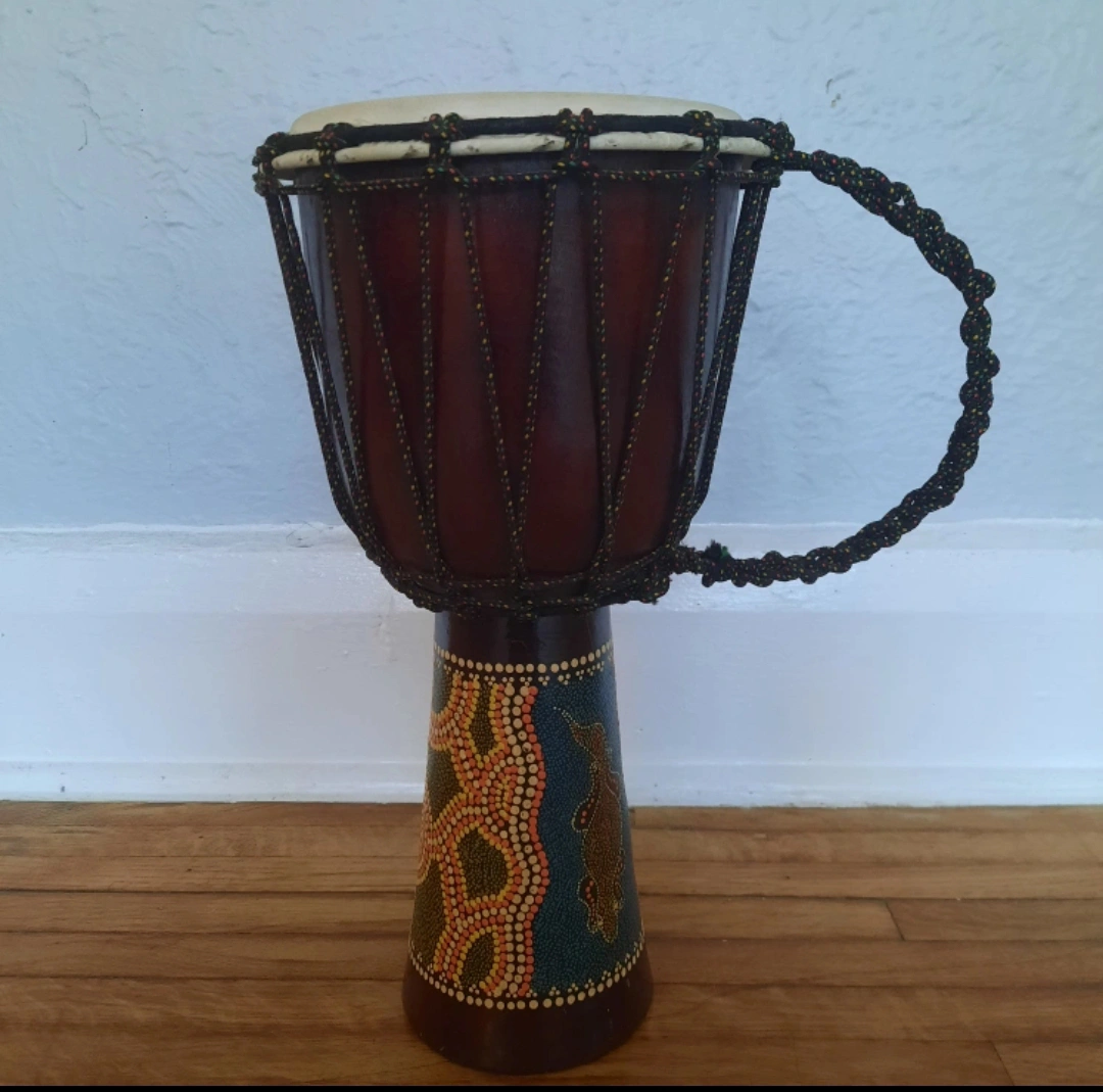 Selling a djembe drum. It has a handle and a unique lizard design on the base. Medium sized made with dark, cherry colour wood. Very good condition. Bought over 25 years ago.