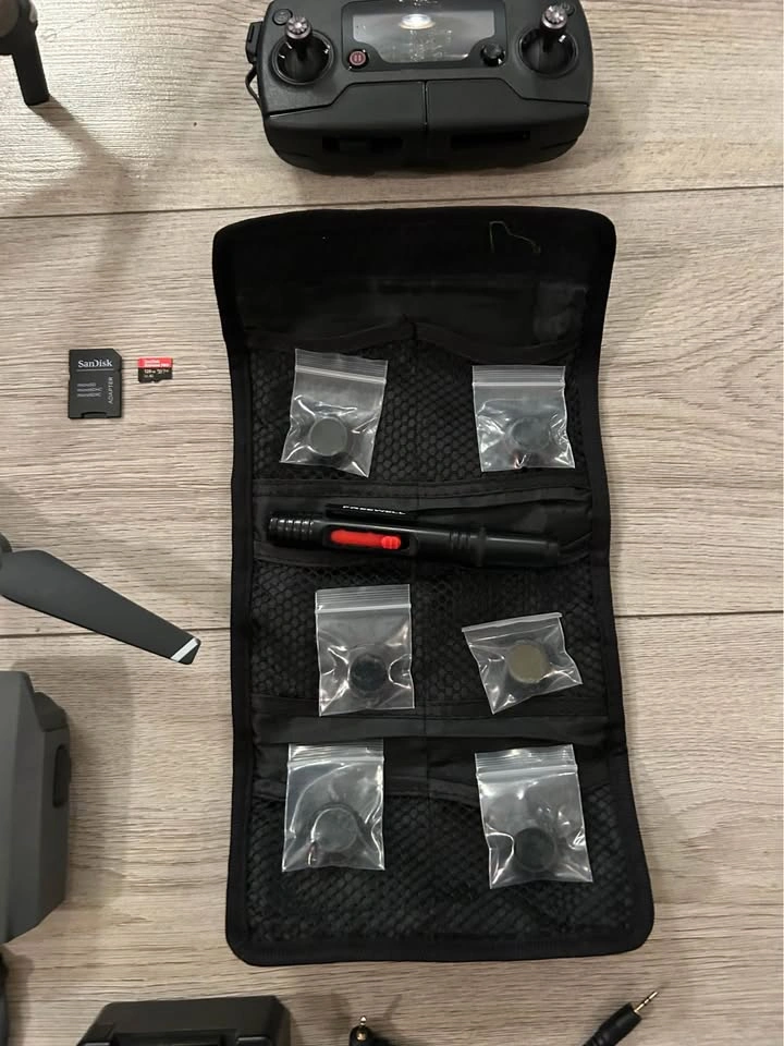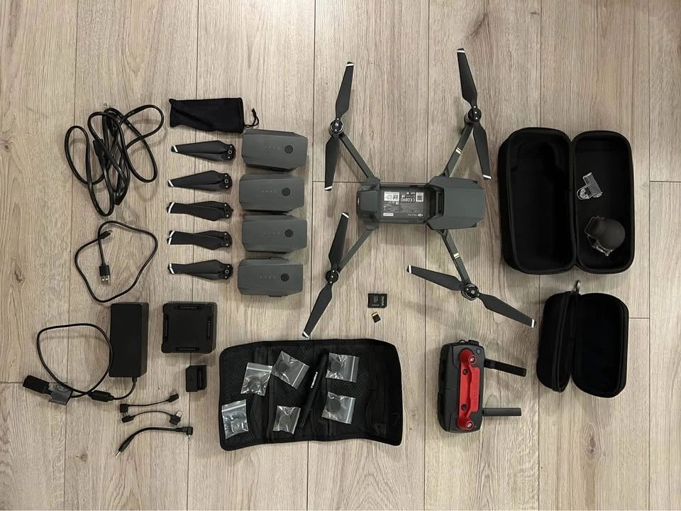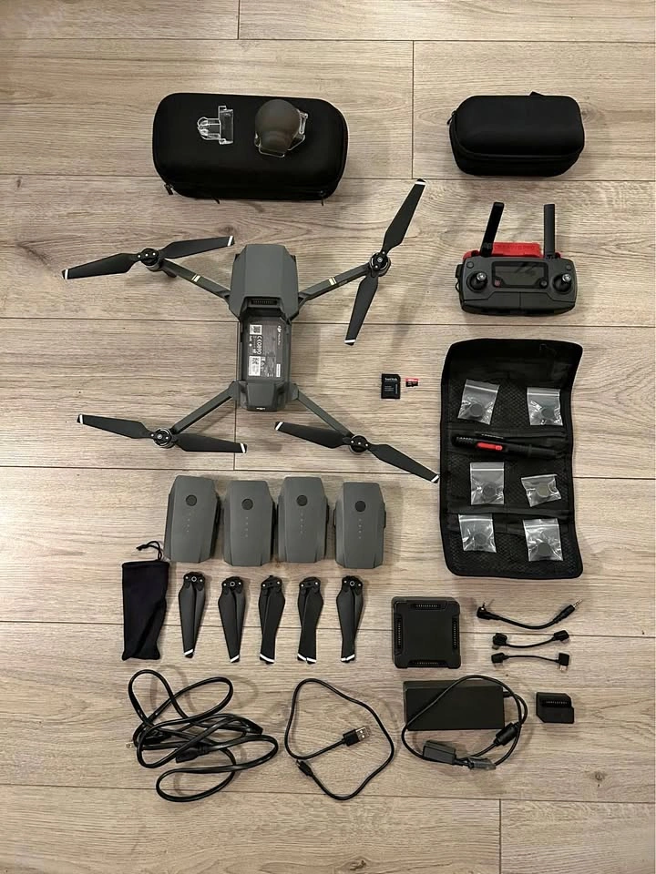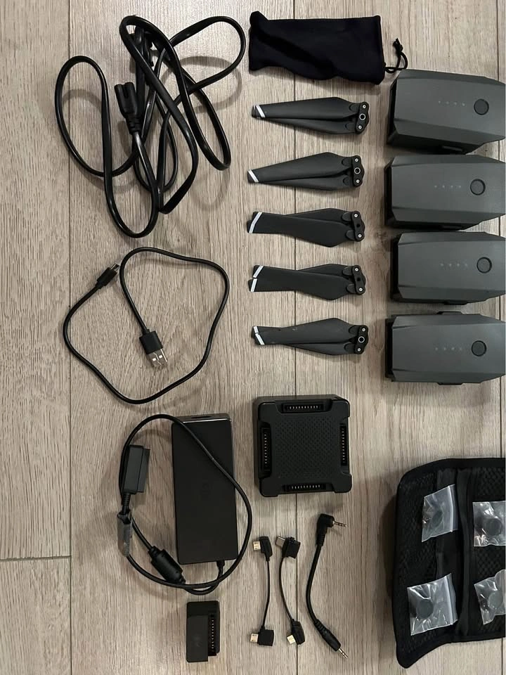 DJI Mavic Pro comes with: - 4 rechargeable battery - 6 Freewell filters : ND32 4K, CPL 4K, ND116 4K, ND8 4K, ND16/PL 4K, ND8/PL 4K - Lens cleaning Pen - 1 Mini SD card Extreme Pro 128GB + Adapter - 1 remote + cable to charge + case - 5 spare propellers - 1 Mavic Battery charging Hub - 1 Power adapter - 1 Mavic battery to power bank adapter - 1 mini USB connector - 1 lighting connector - 1 USB-C connector - 1 gimbal holder - 1 gimbal protector.