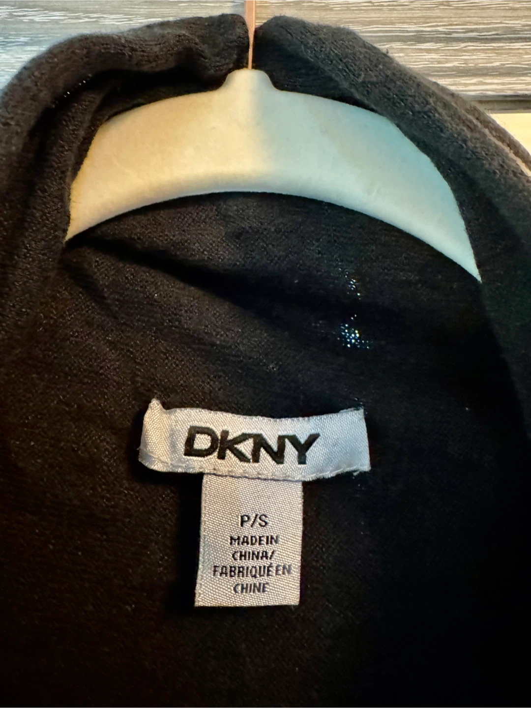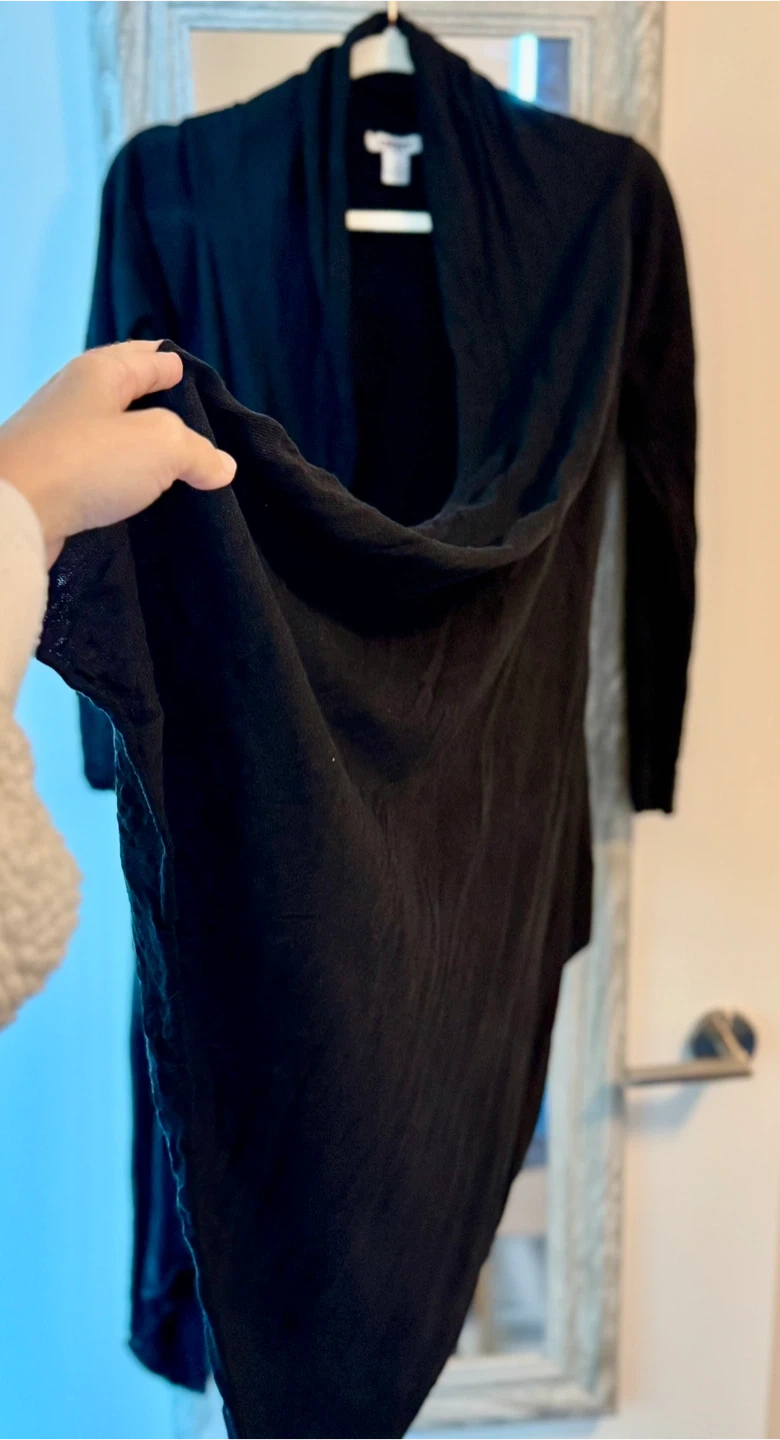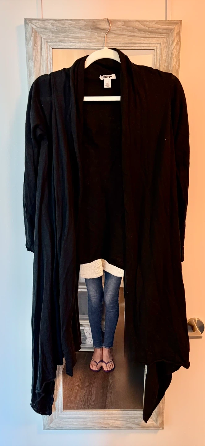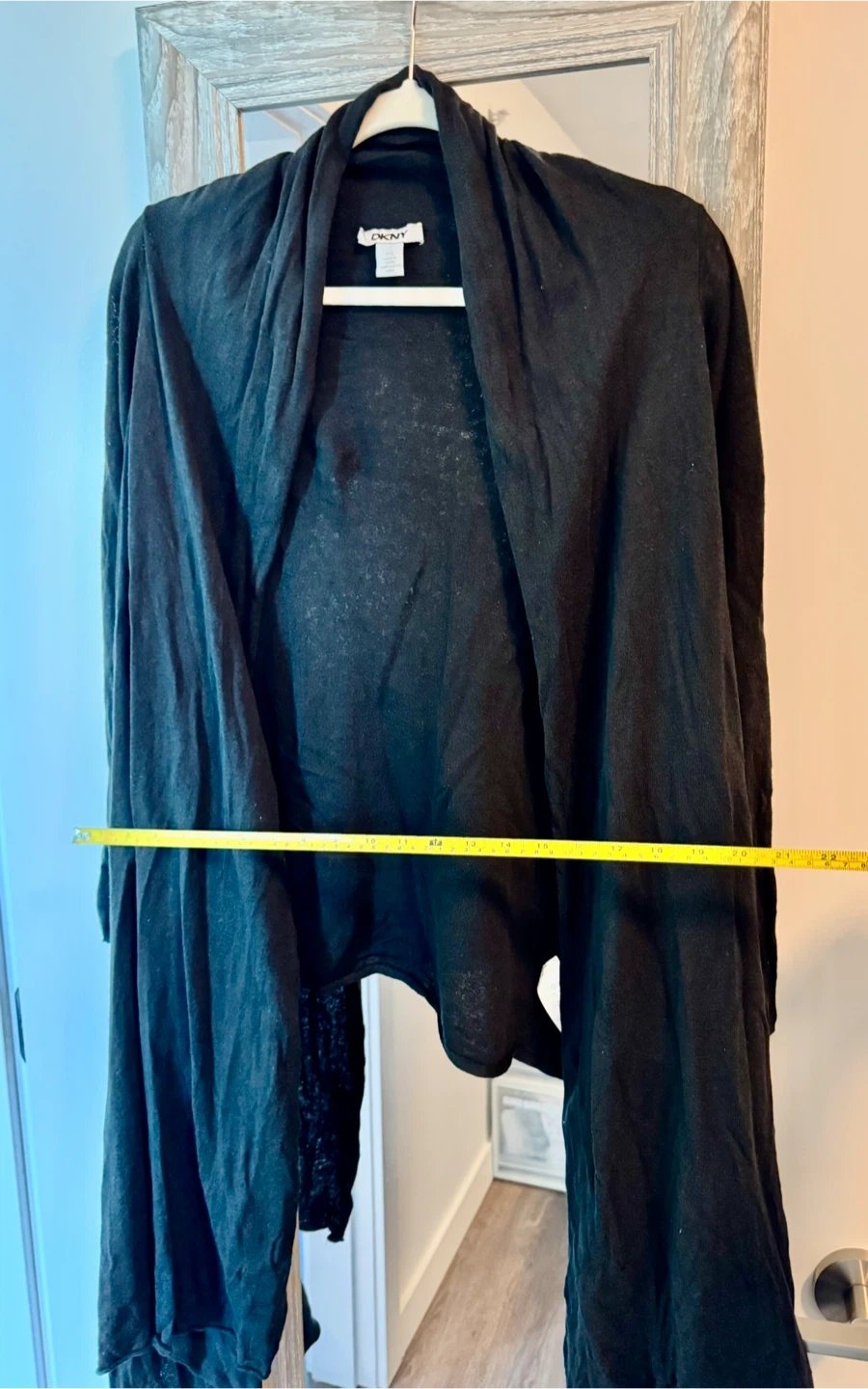 DKNY Elegant Black Apparel_Long Draped Knitted Light Sweather Coat Selling a black DKNY cardigan in size small. It's in great condition and perfect for layering. The material is soft and comfortable, ideal for everyday wear. The length from top to bottom is approximately 33 inches, and the width across the back is about 18 inches. In very good condition. Sleek DKNY design. Timeless and versatile. In very good condition. Very unique and elegant sweater coat, suitable for spring and fall weather, also the summer and winter when you stay inside. Very comfortable and easy to match all of your other clothes. Retail price : CAD $195