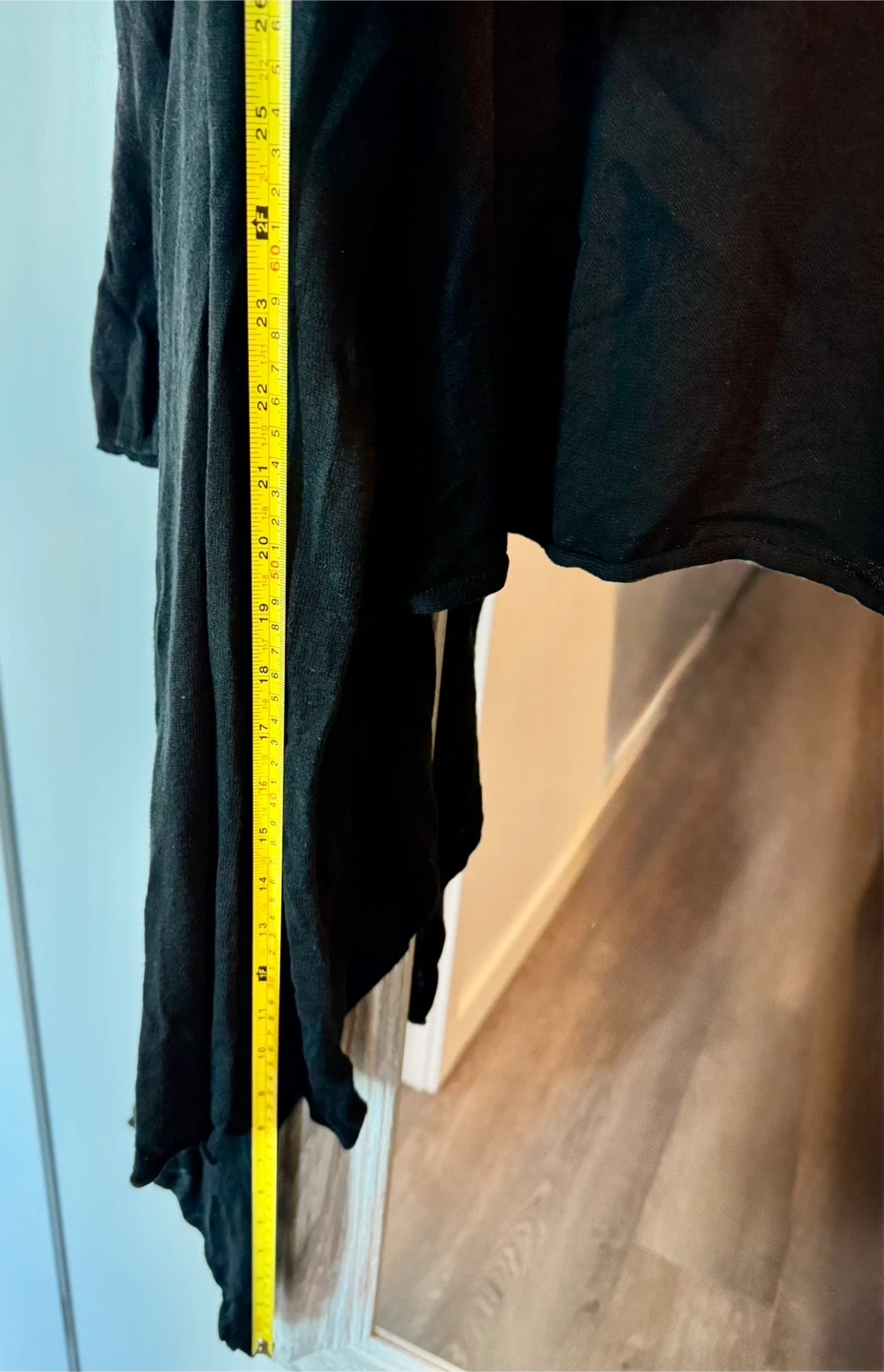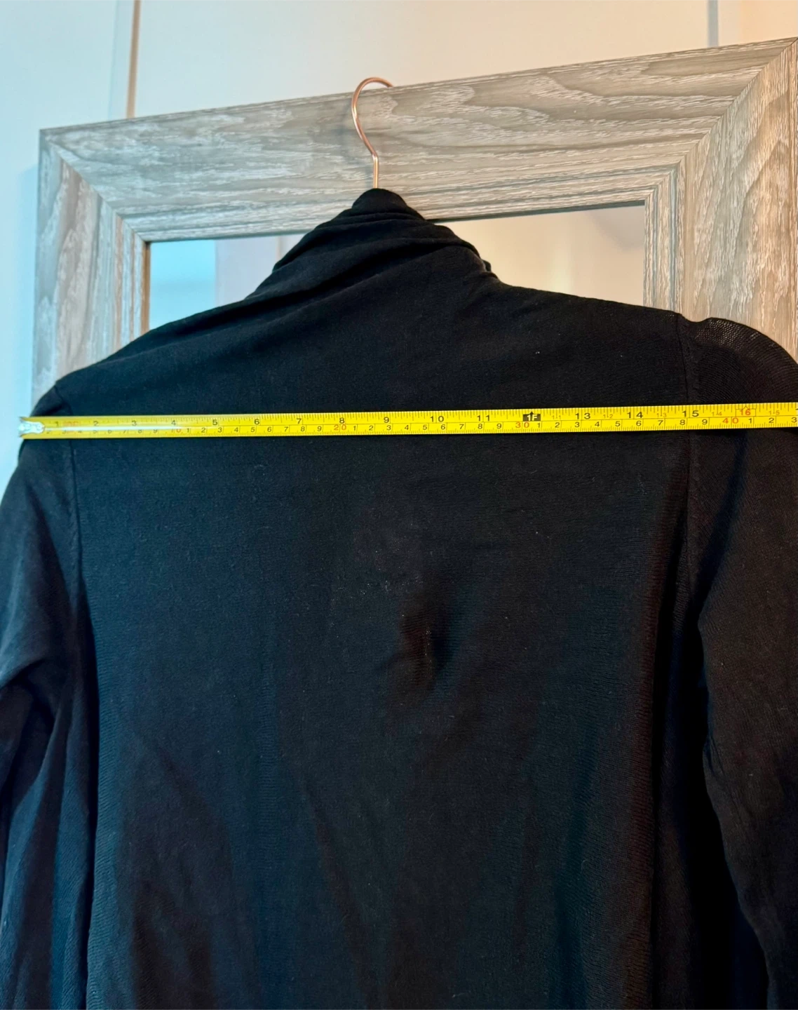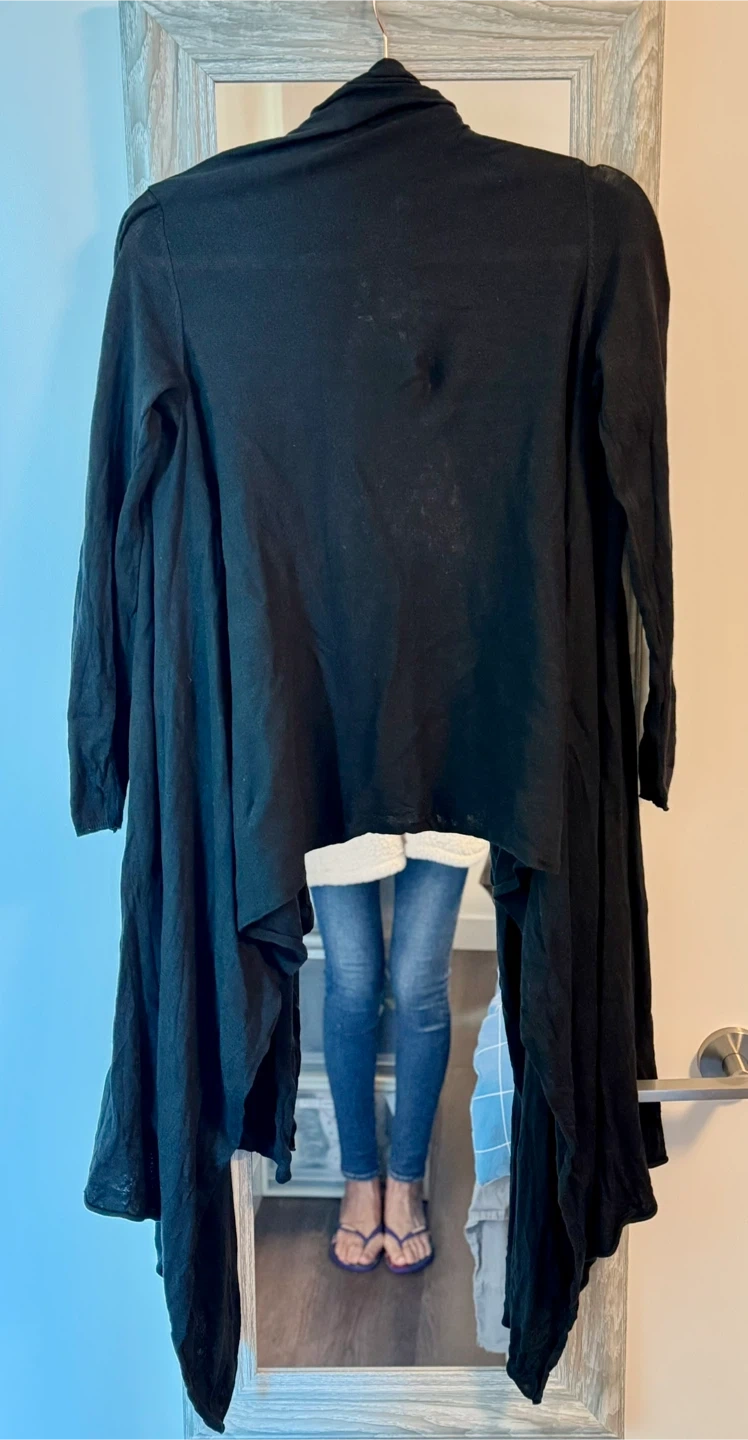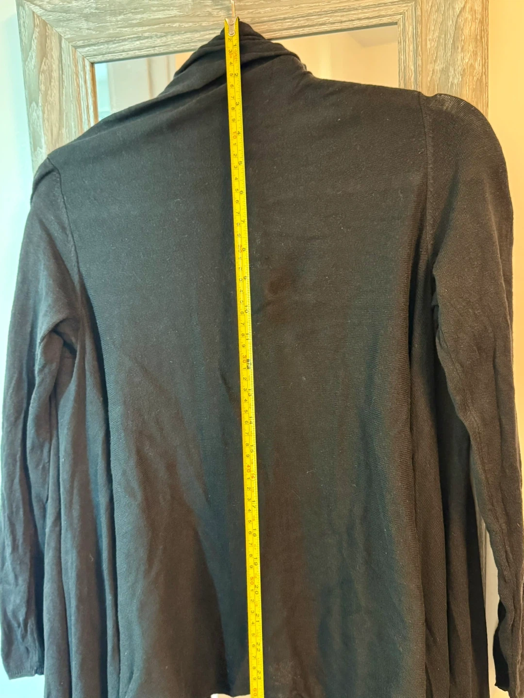 DKNY Elegant Black Apparel_Long Draped Knitted Light Sweather Coat Selling a black DKNY cardigan in size small. It's in great condition and perfect for layering. The material is soft and comfortable, ideal for everyday wear. The length from top to bottom is approximately 33 inches, and the width across the back is about 18 inches. In very good condition. Sleek DKNY design. Timeless and versatile. In very good condition. Very unique and elegant sweater coat, suitable for spring and fall weather, also the summer and winter when you stay inside. Very comfortable and easy to match all of your other clothes. Retail price : CAD $195
