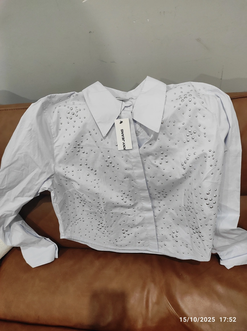 Here's a light blue KNY shirt blouse. It features a classic collar and long sleeves. The front is adorned with silver beads, adding a touch of sparkle to the top. It's a size medium