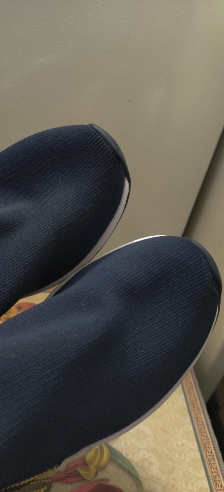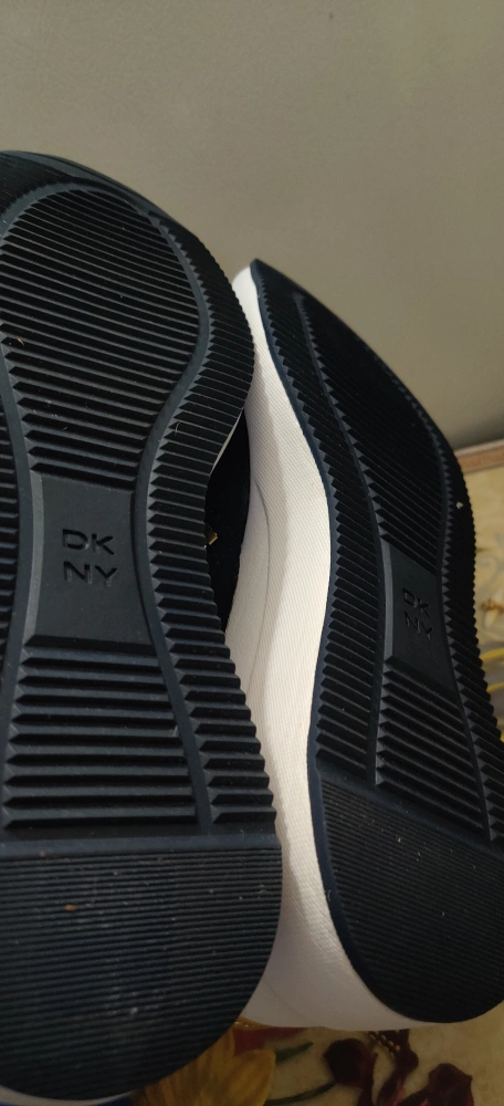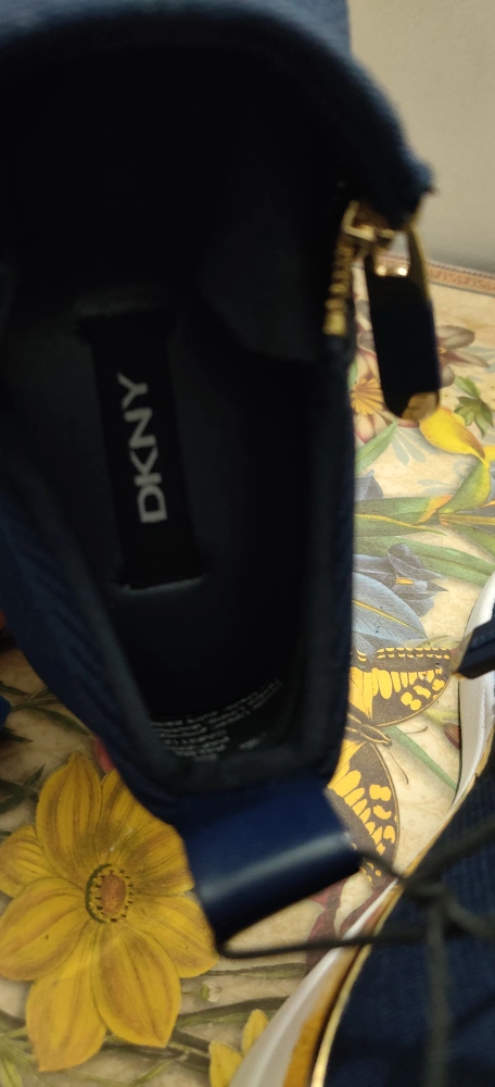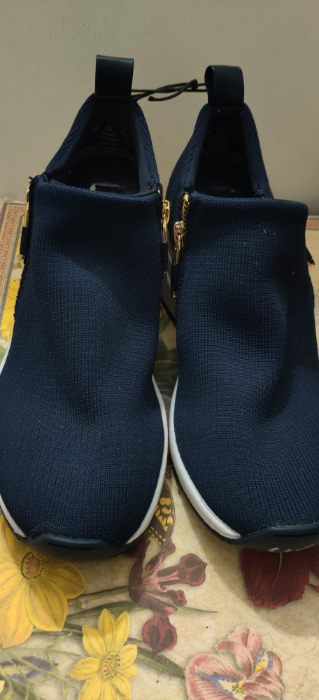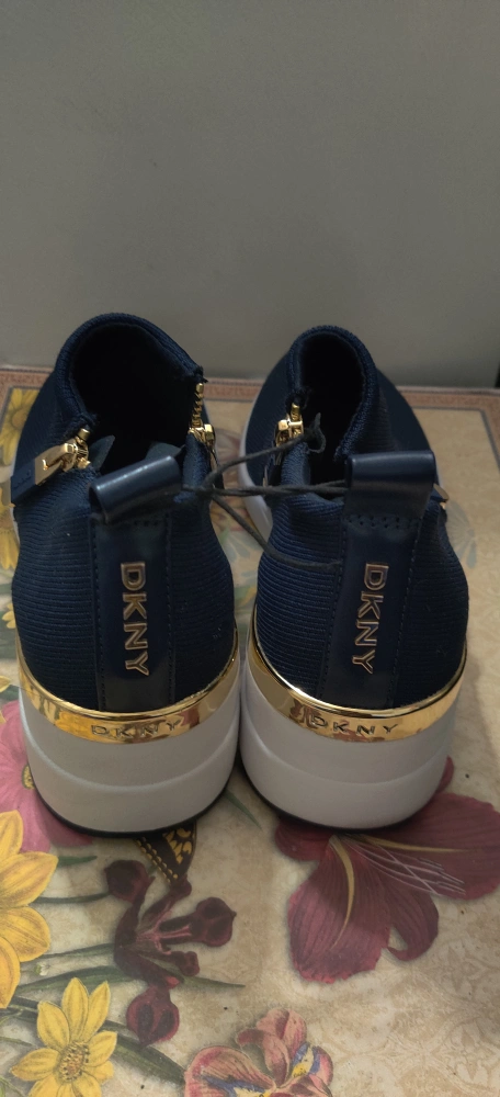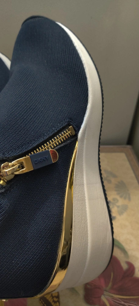 These DKNY wedge sneakers are in excellent condition! They feature a stylish navy blue knit upper with a gold zipper detail and a white wedge sole. The DKNY logo is visible on the zipper and the heel. Roughly 2inches high. Price is firm. Item is preowned so minor stains should be expected