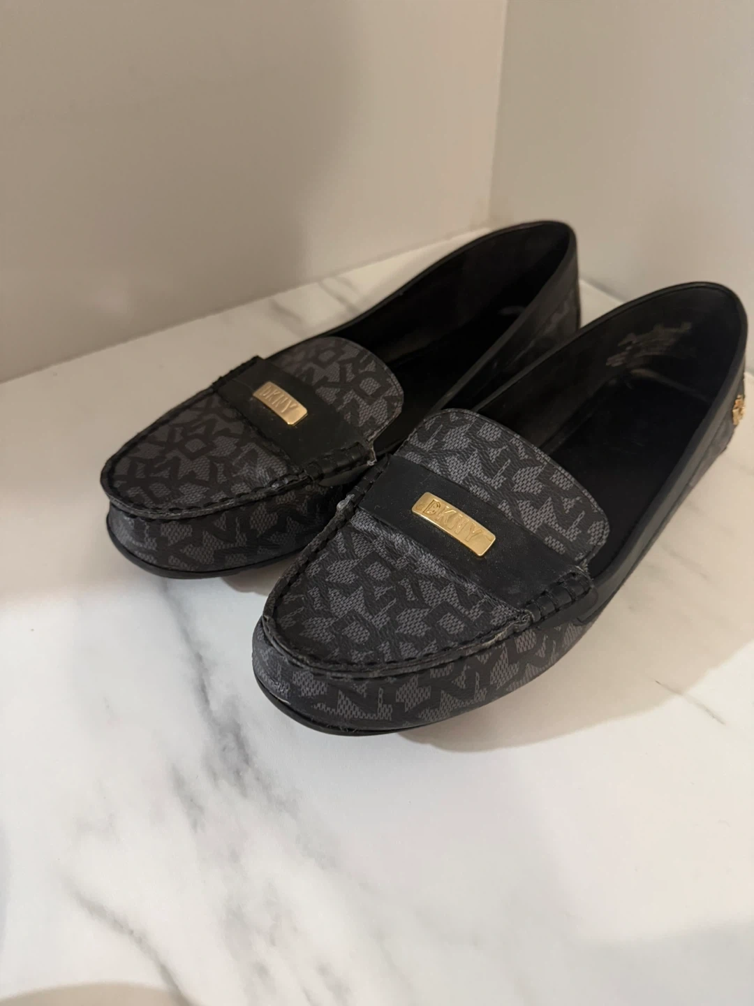 Selling a pair of DKNY women's loafers in size 7.5 US. They have a stylish design and are made with synthetic materials. These loafers are perfect for everyday wear!
