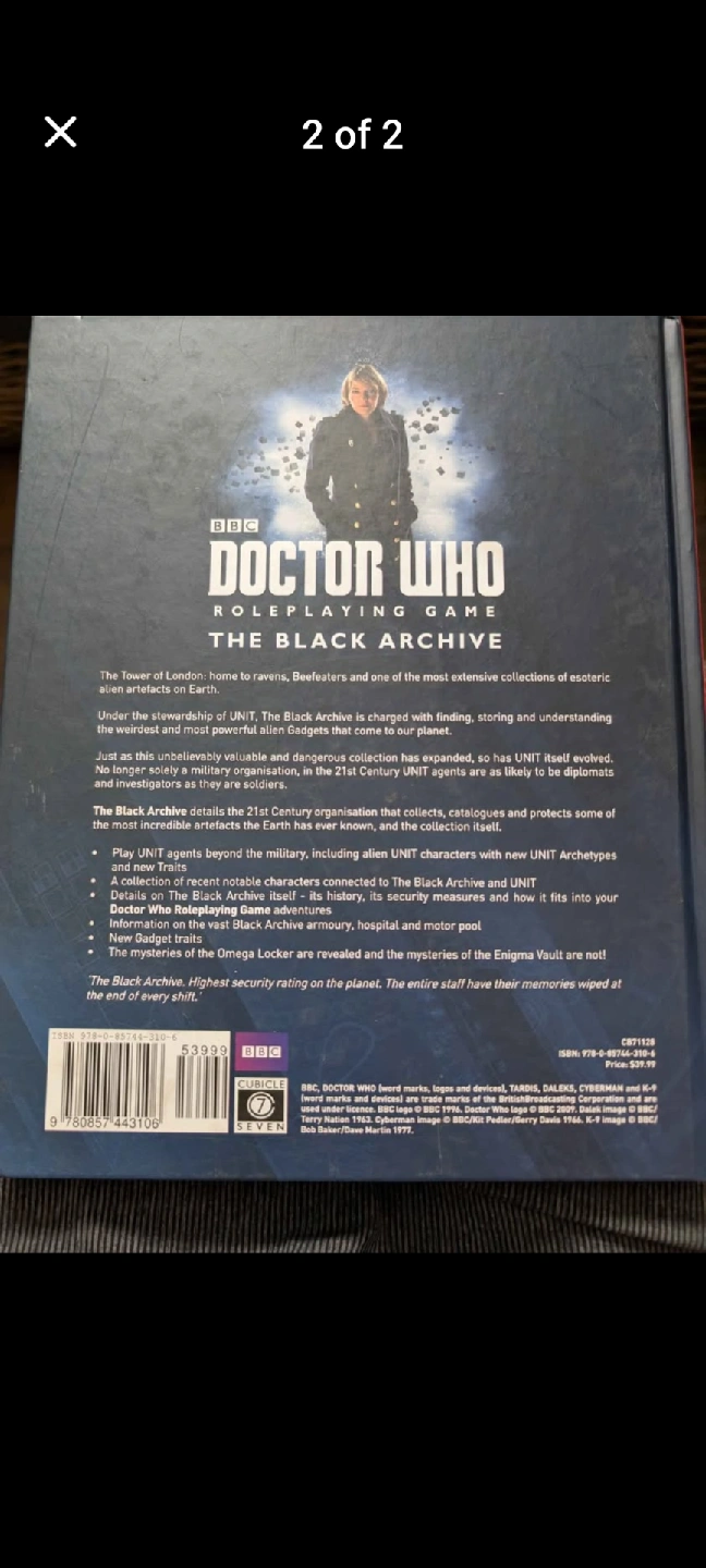 Selling a Doctor Who roleplaying game book called The Black Archive. It details the 21st-century organization that catalogues and protects some of the most incredible artifacts the Earth has ever known, and the collection itself. It includes UNIT agents beyond the military, new UNIT archetypes, and details on The Black Archive itself, including its history, security measures, and how it fits into your Doctor Who campaign. Brand new. Never used. 144pages