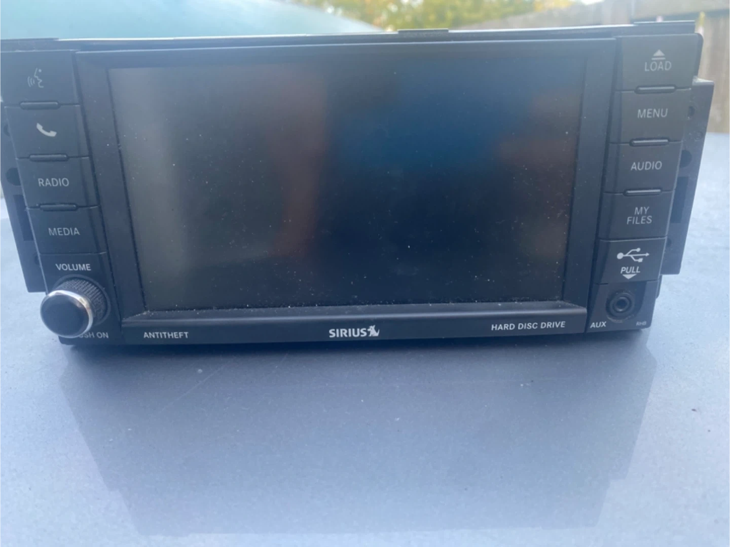 Sirius XM radio hard disc drive available. It has buttons for radio, media, volume, menu, audio, and my files. It also has an AUX port and anti-theft feature and Navigation $300