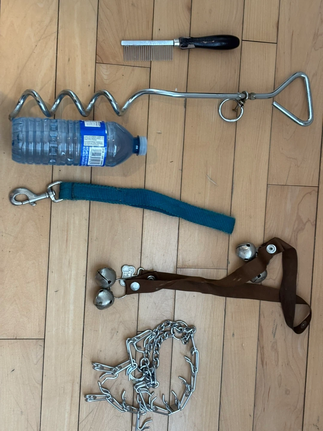 Selling a collection of dog accessories! Includes a comb, a stake (sold), a leash, a set of bells, and a chain. All in good condition and ready for a new home for your furry friend
