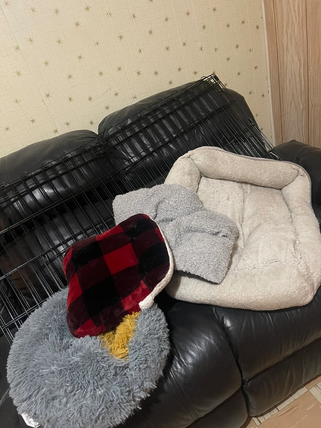 Show allSelling a dog bed and crate. The bed is round and grey, and the crate is black. Great for your furry friend!