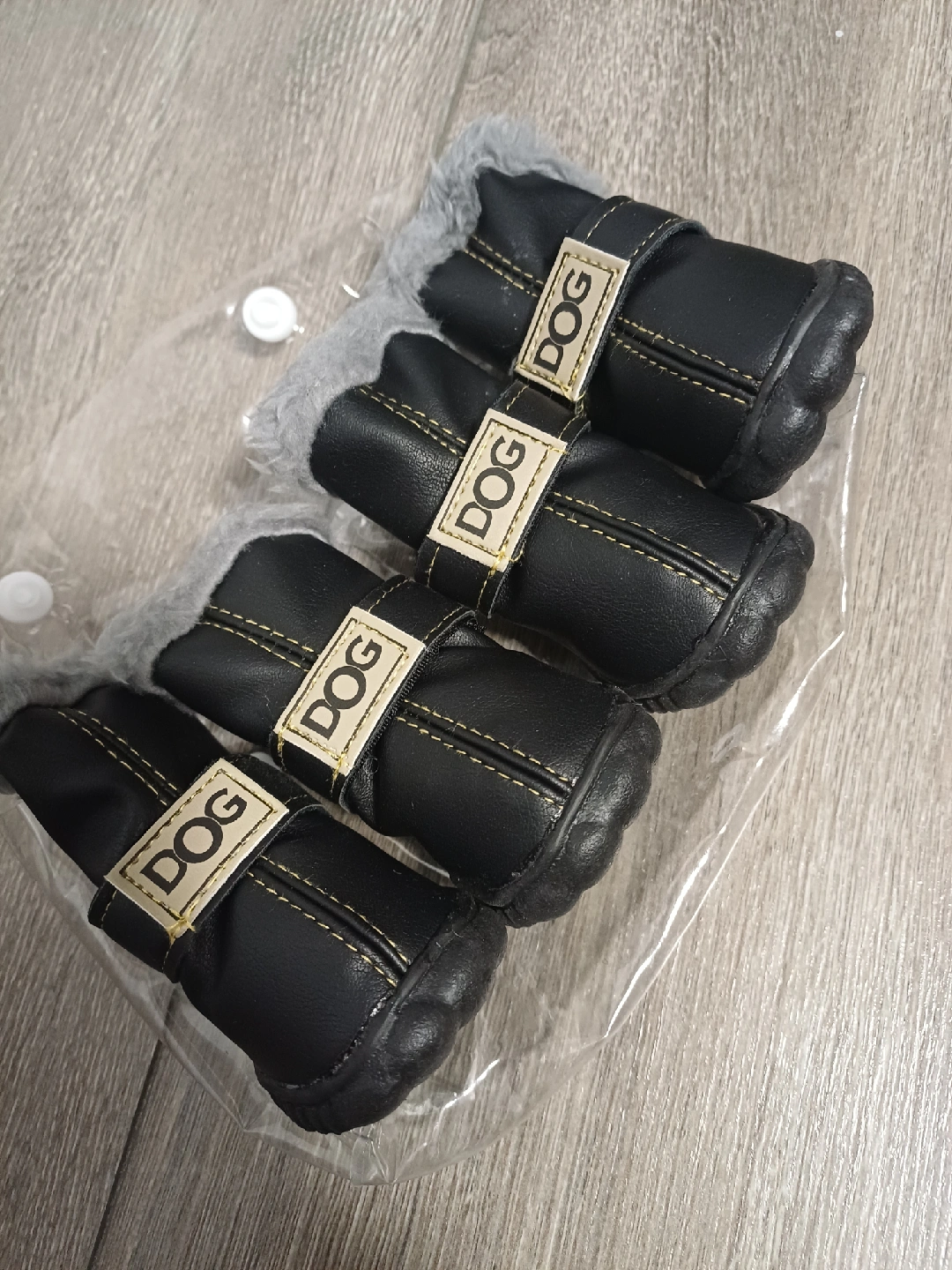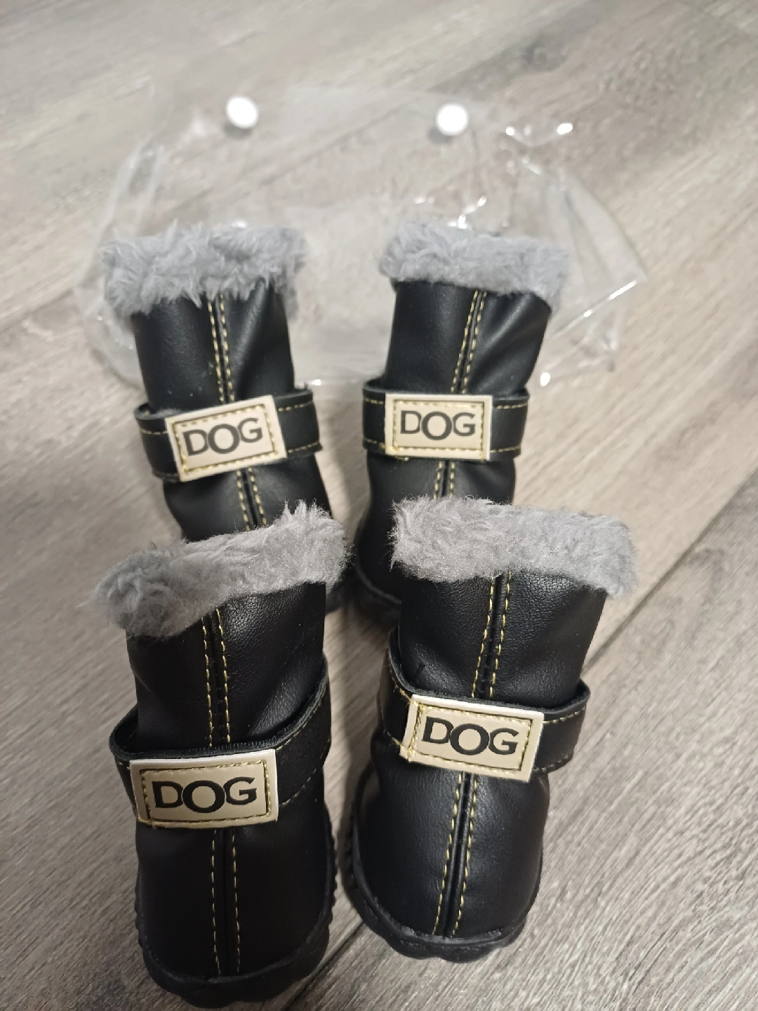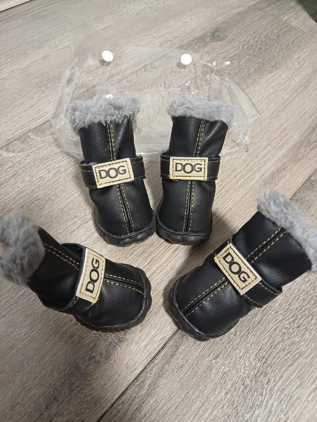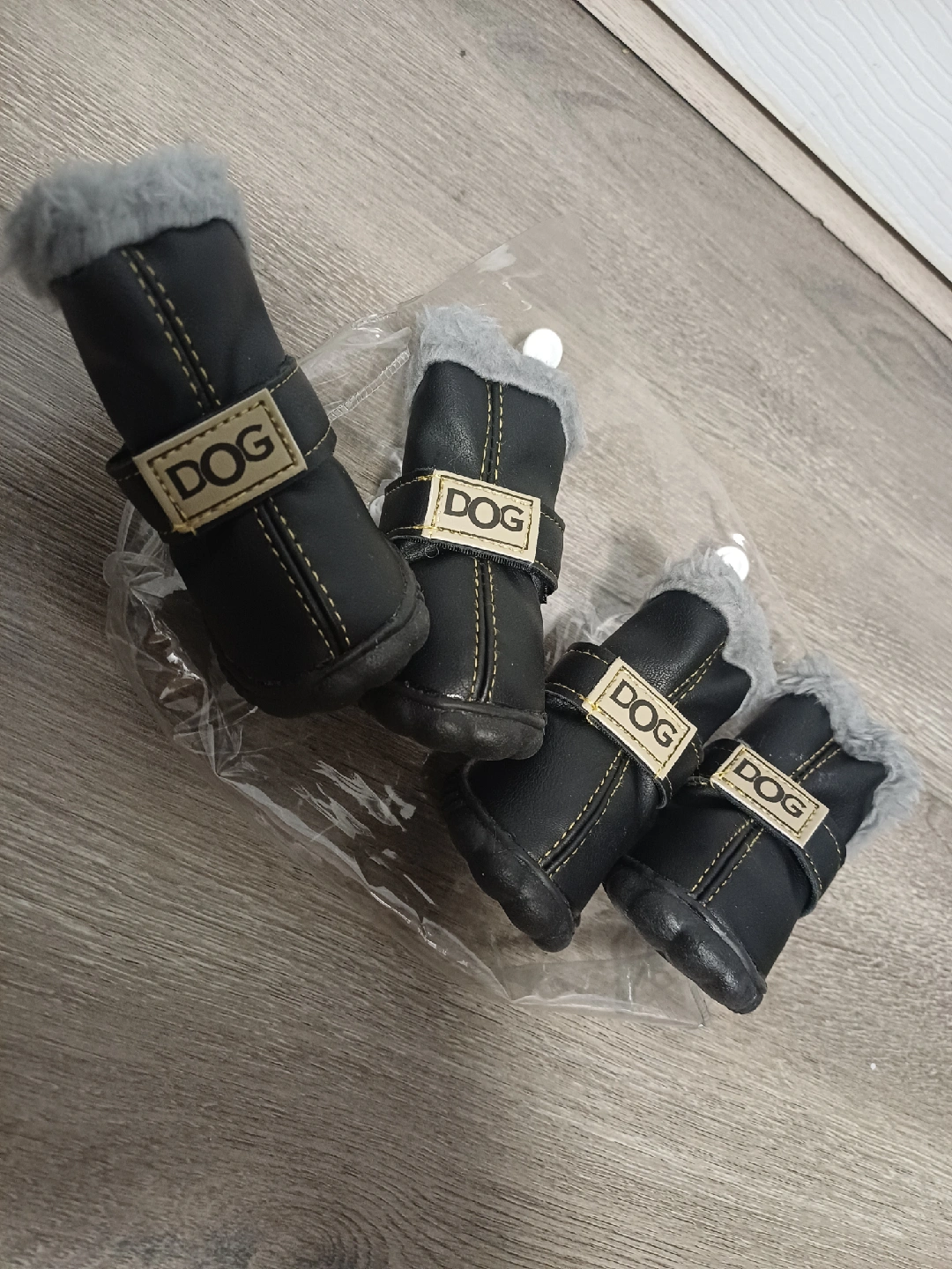 These are brand new dog boots! They're black with a cute faux fur trim. Perfect for keeping your pup's paws clean and warm on walks. Check them out ๐๐..