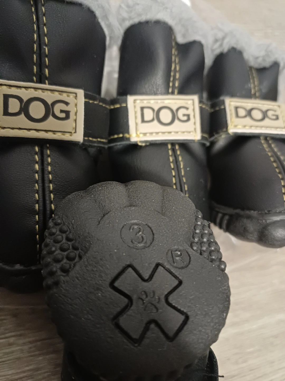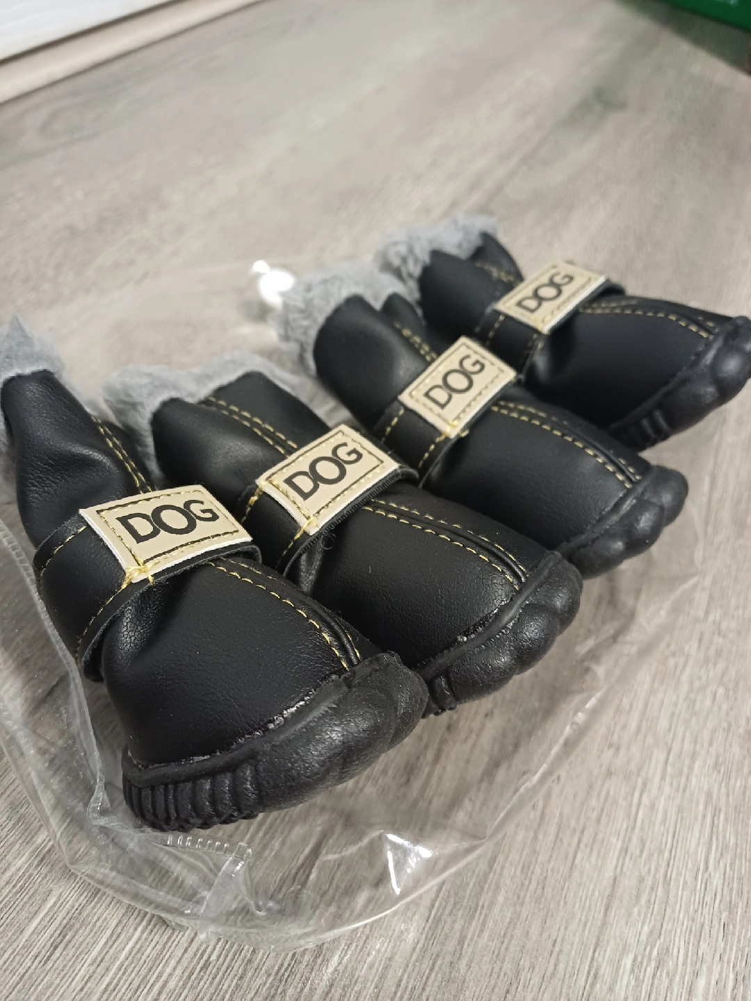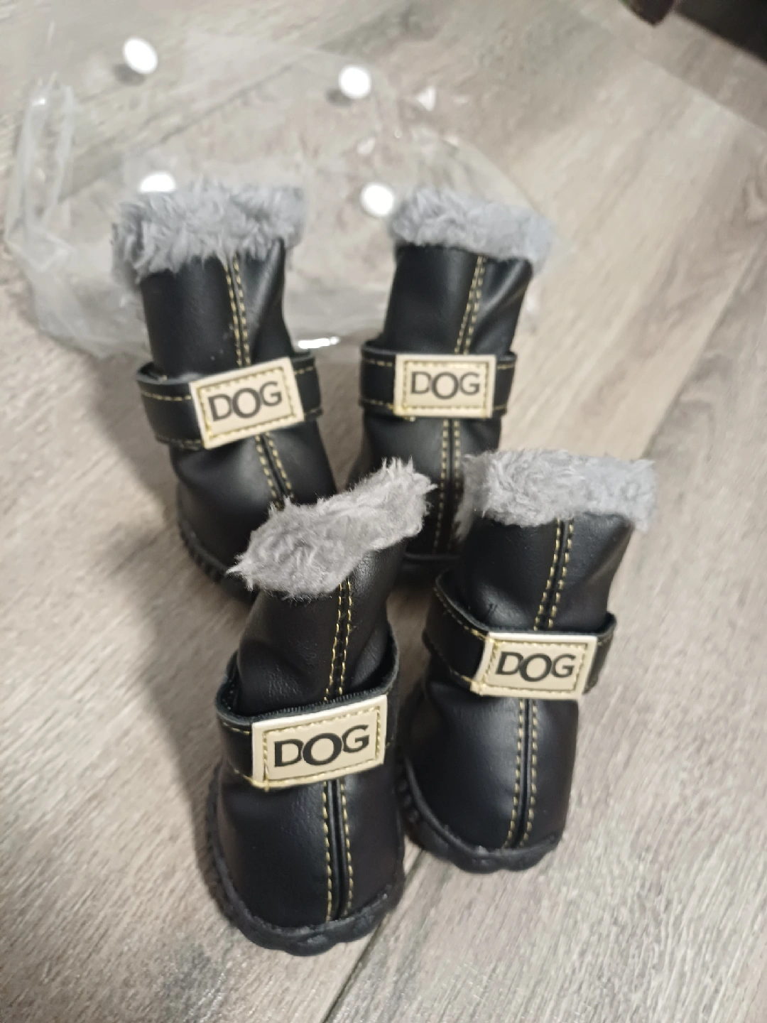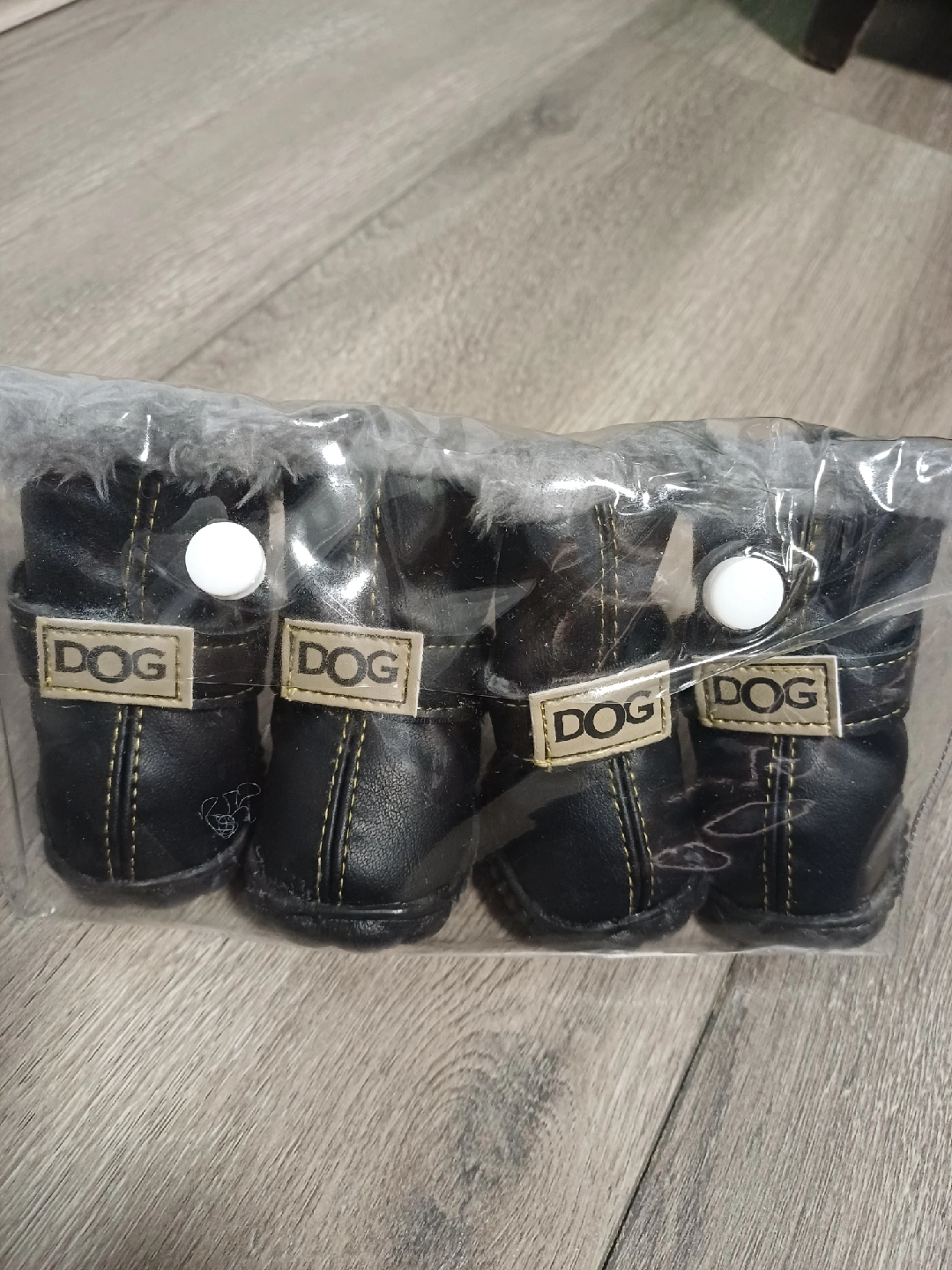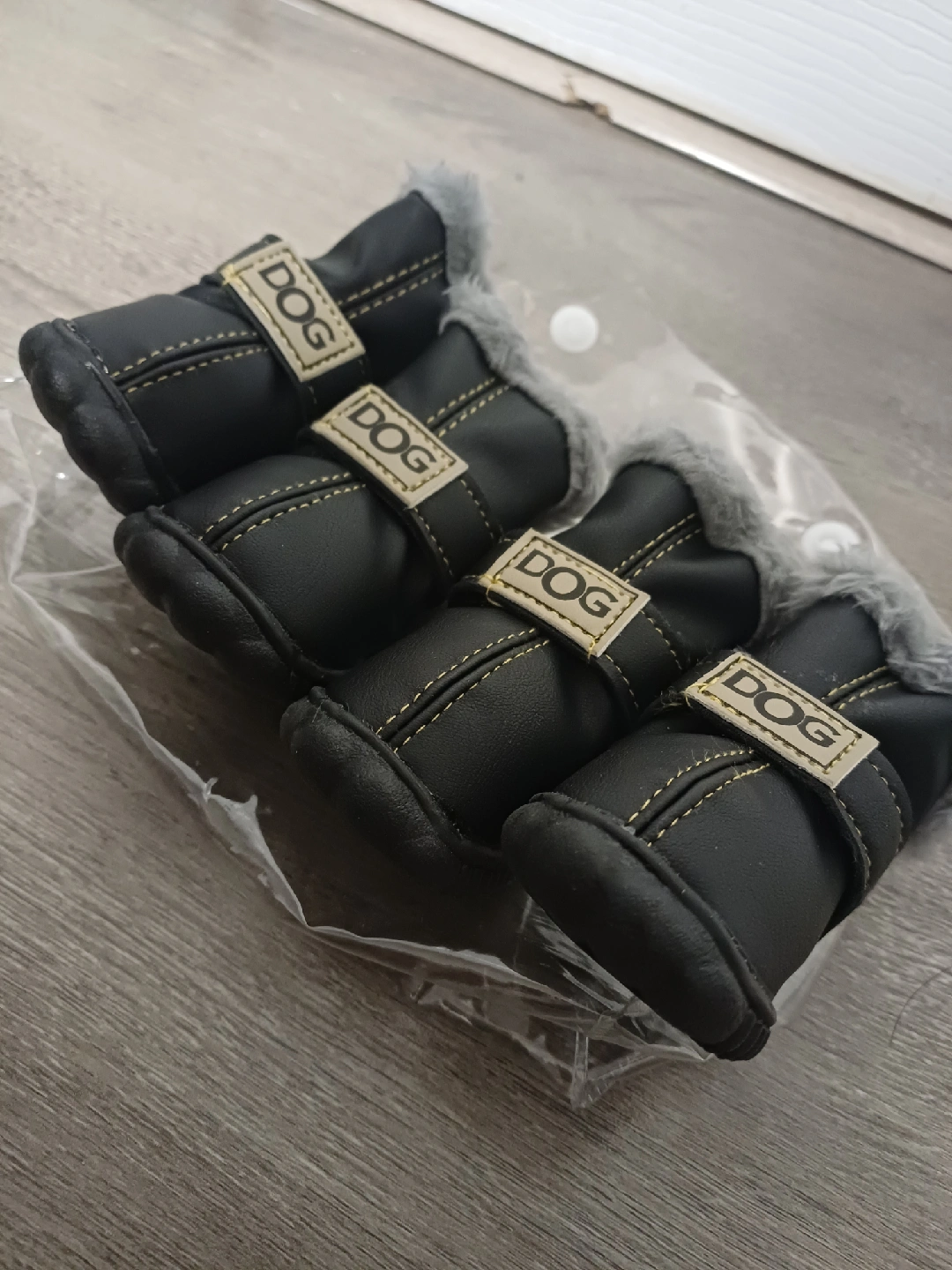 These are brand new dog boots! They're black with a cute faux fur trim. Perfect for keeping your pup's paws clean and warm on walks. Check them out ๐๐..