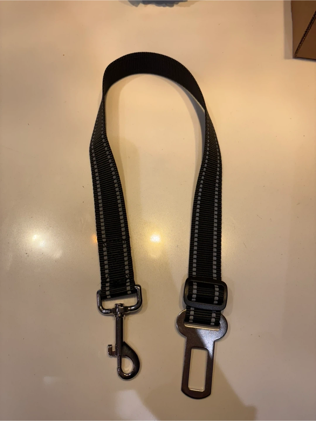 Selling a black dog car seat belt restraint! It's in great condition and perfect for keeping your furry friend safe during car rides. It easily attaches to your car's seat belt buckle and your dog's harness or collar