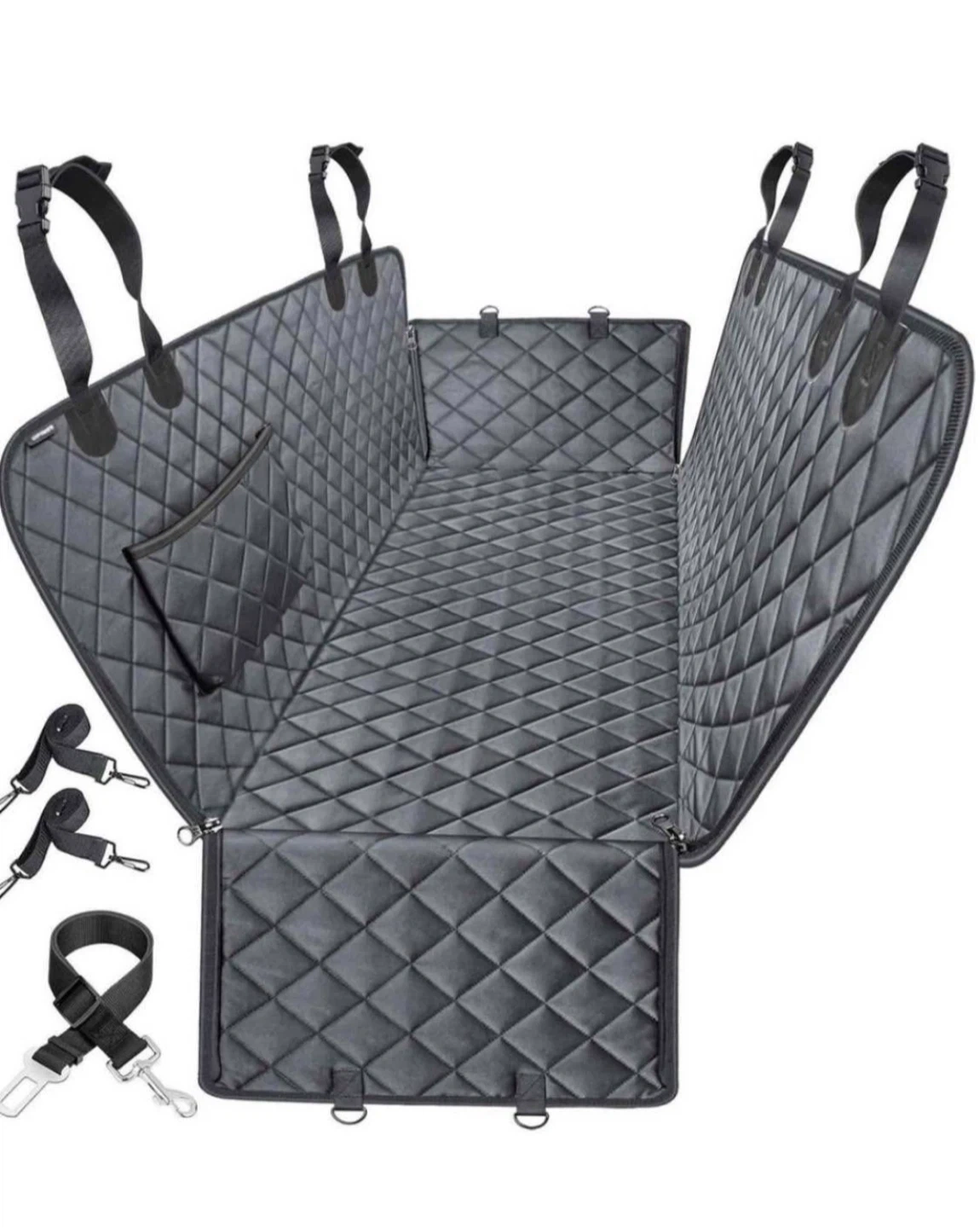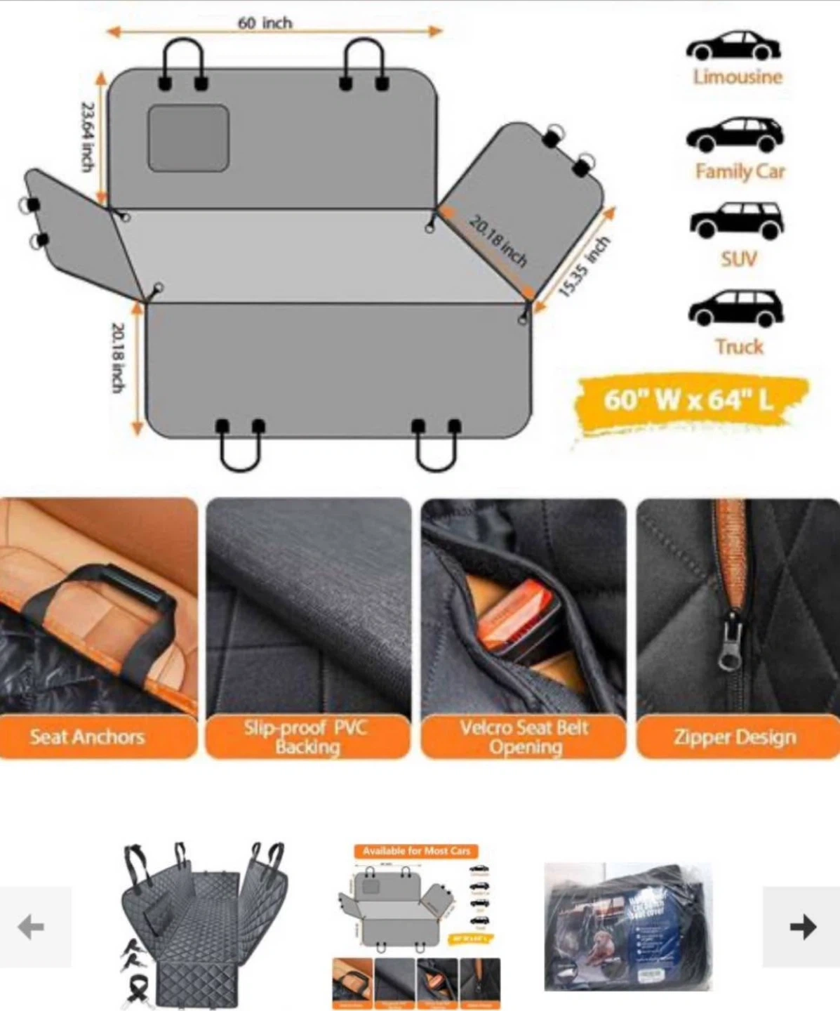 Keep your car seats clean and protected with this brand new dog car seat cover! It's designed to fit most cars, including sedans, SUVs, and trucks. Key features: - Waterproof material - Slip-proof PVC backing - Velcro seat belt opening - Zipper design for easy access - Seat anchors to keep it in place The cover measures 60 inches wide by 64 inches long, offering ample coverage for your back seat