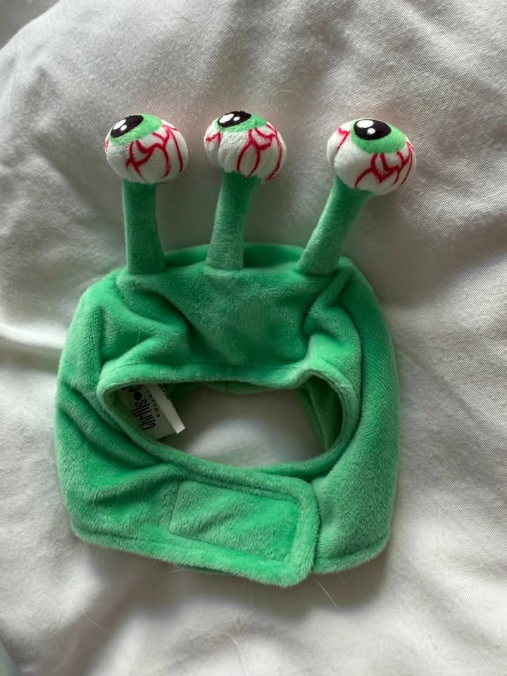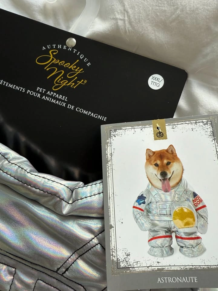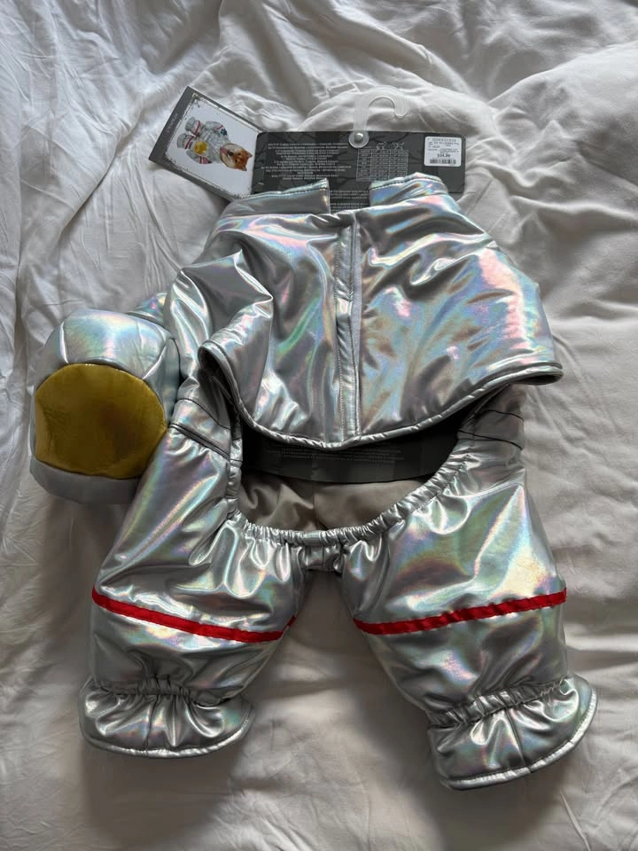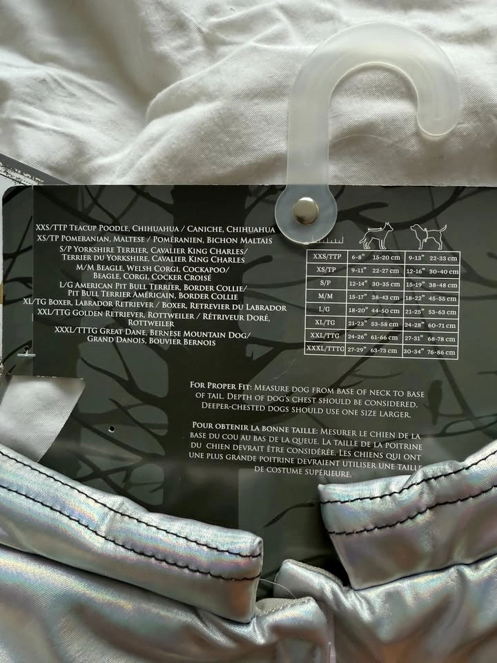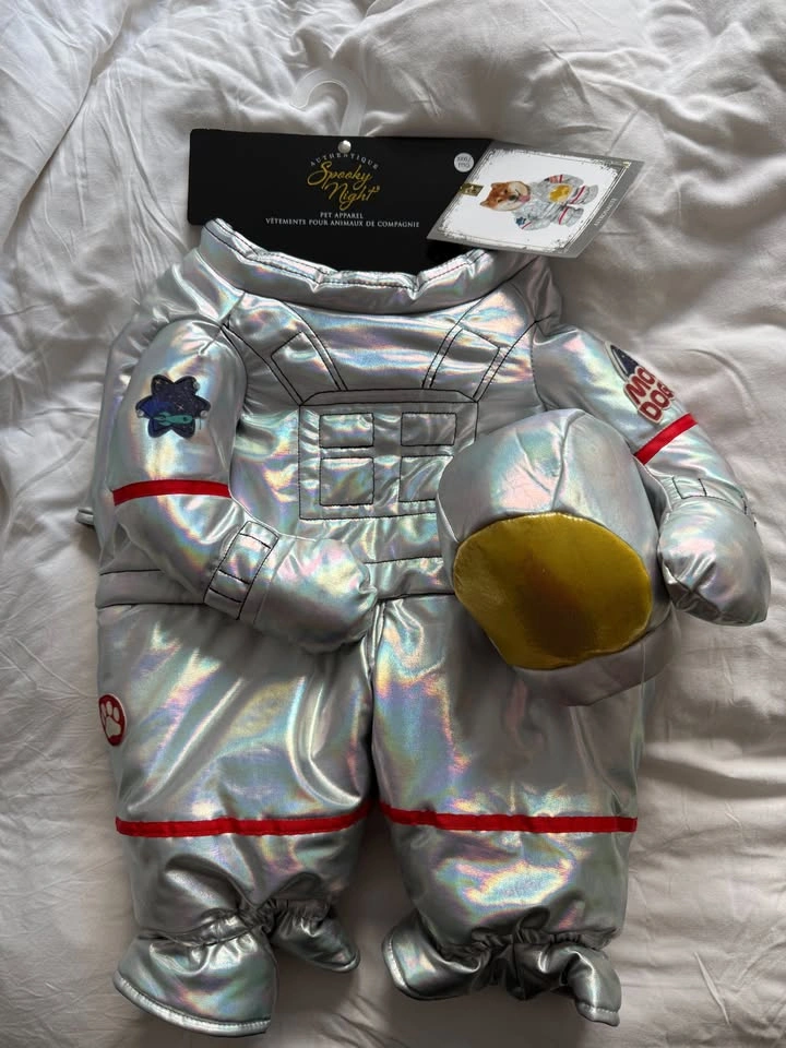Only worn for about 10 minutes to take a photo lol Pet Silver 'Moon Dog' Space Suit: Size XXXL Shown on my dog (65 pounds) but it was big on her - would fit a larger dog Pet Monster Hat Size S Shown on my cat (12 pounds) Would fit a small dog or larger cat