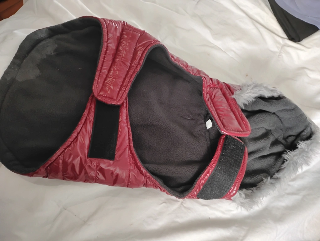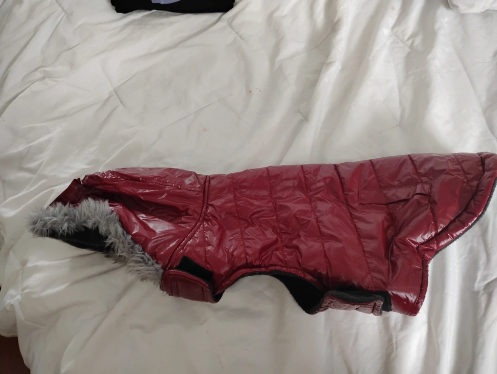 A cozy burgundy dog coat to keep your furry friend warm during those chilly walks! It features a hood with faux fur trim and adjustable velcro straps for a snug fit size medium