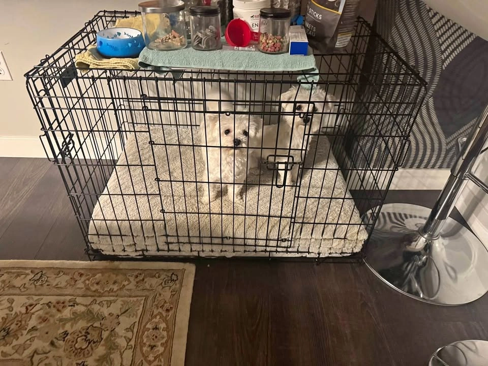 Metal dog crates, 2 available. Can fit 2 small dogs, or 1 medium dog. 2 doors, one on long side one on short side.