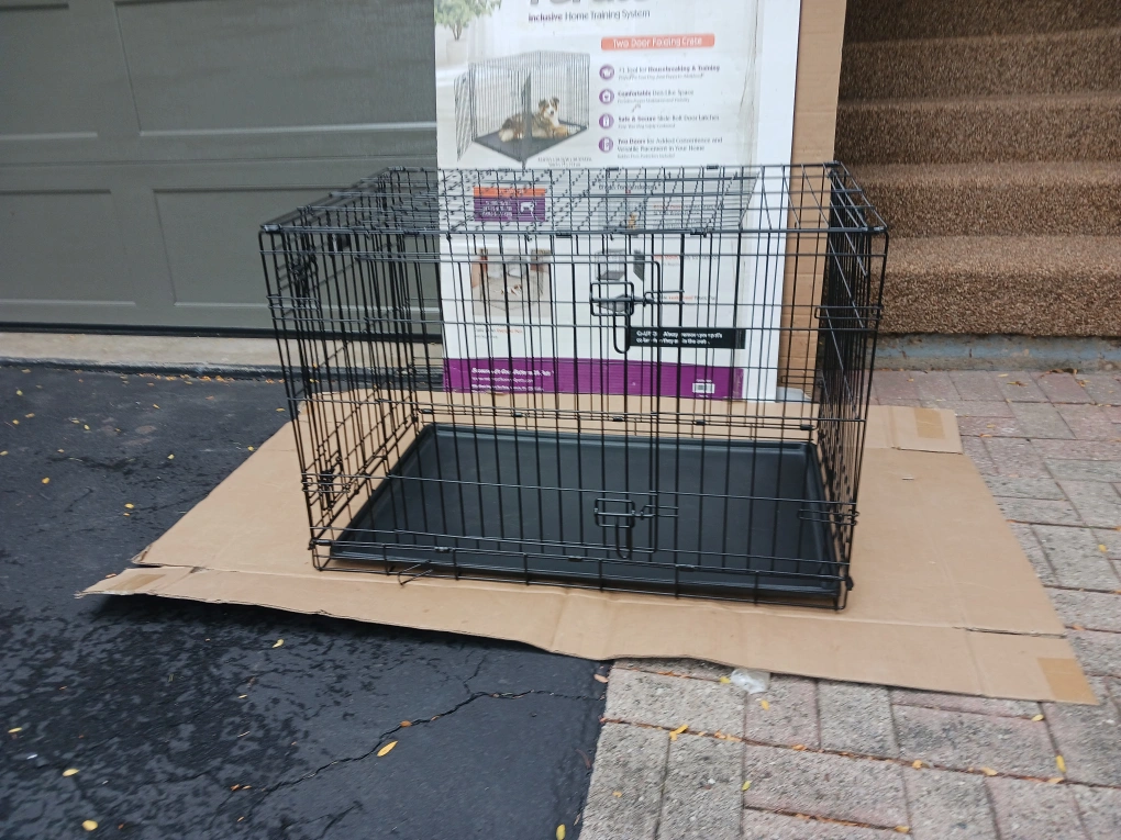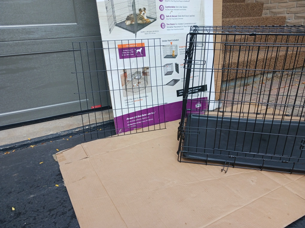 Bought for a Goldendoodle puppy. Was great until she outgrew it! It has 2 doors, so you can place it anywhere you want. There's a movable divider so that you can make the crate smaller for a puppy. See picture # 3 & 6. Sliding bolt locks on the both sets of doors. Folds down, without tools, to use while travelling. Plastic pan for easy clean up.