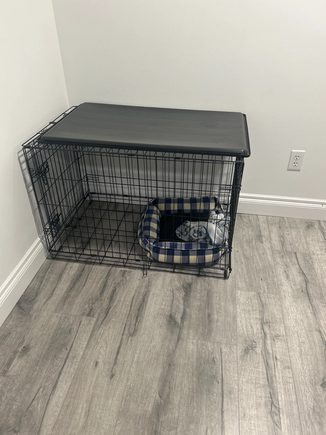 Selling a dog crate that's in good condition! It comes with a comfy bed inside, perfect for your furry friend to relax in. The crate is sturdy and provides a safe space for your pet