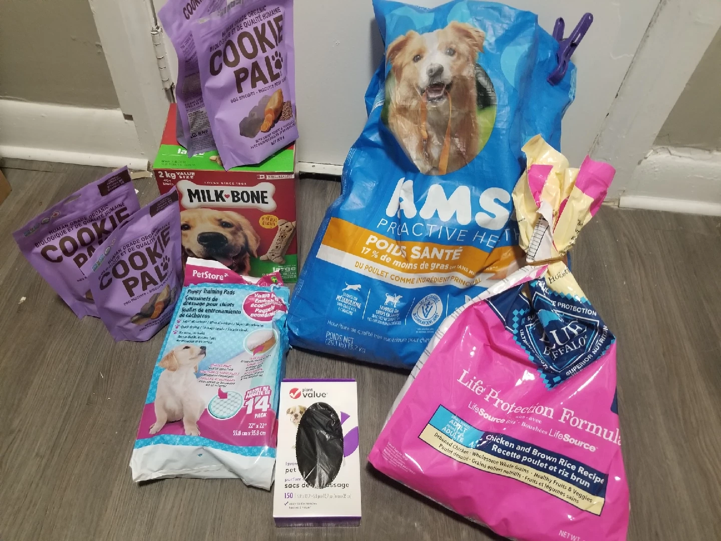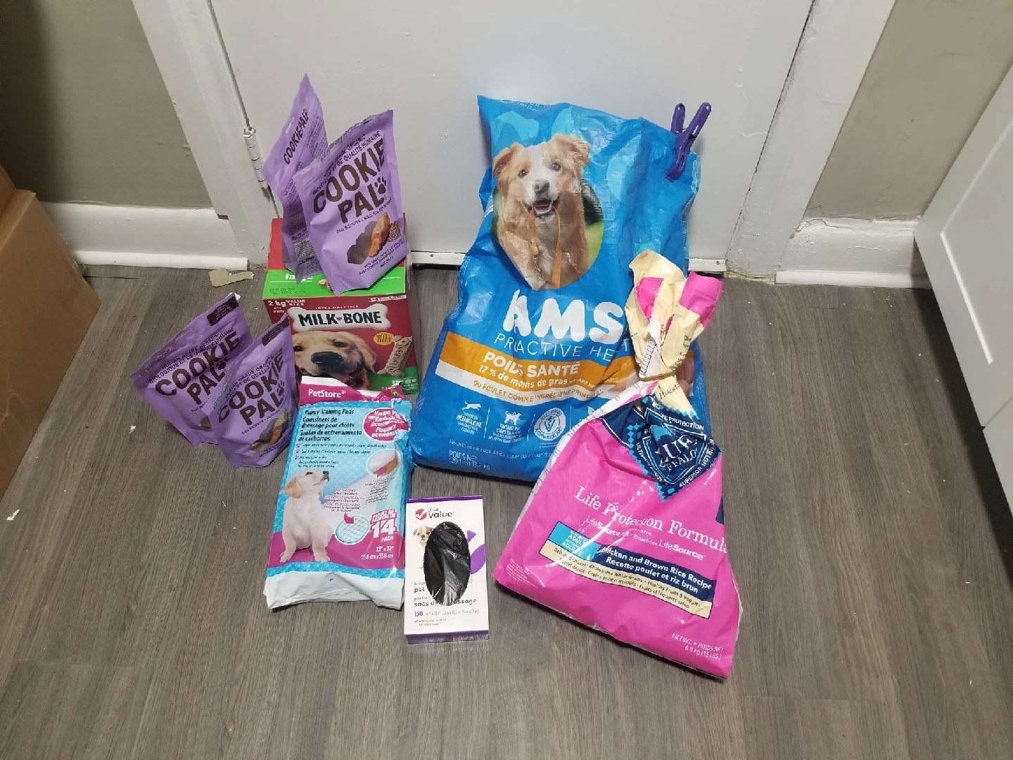 Selling a bundle of dog food and treats, including: - AMS Proactive Health dog food - Milk-Bone dog biscuits - Cookie Pal dog treats - Petstore puppy training pads - Value Pet Sack doggie bags - Life Protection Formula dog food Milk bones - only a few missing Iams dog food -13.2 kg more then half the bag left Blue buffalo dog food- only some left Poop bags - only taken 1 out Treats About 7 puppy pads