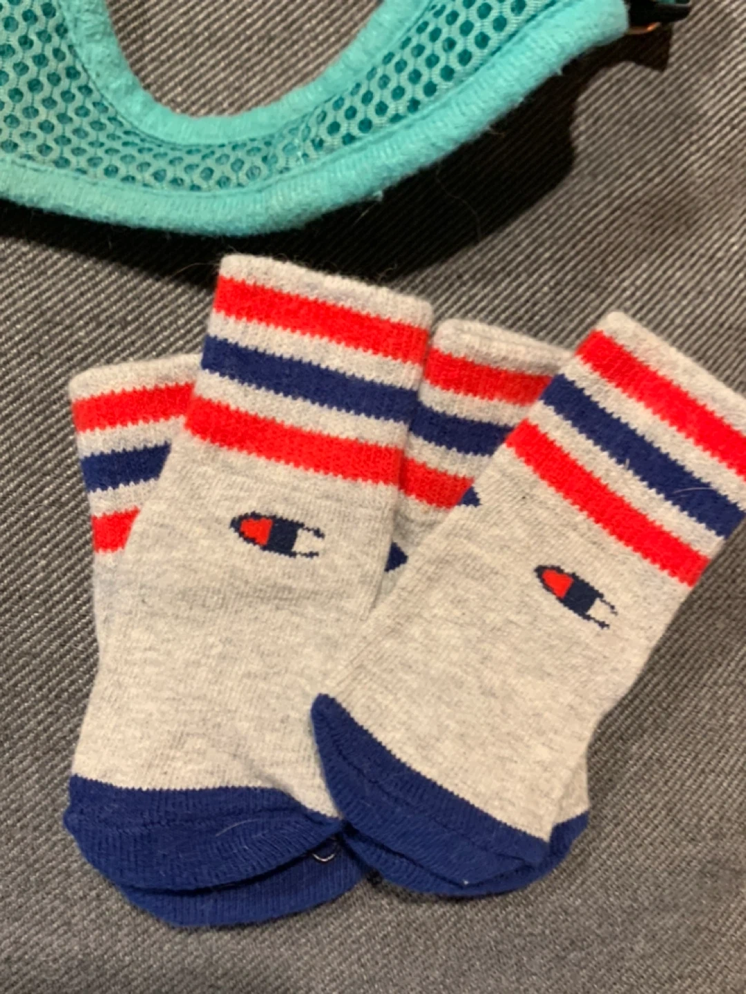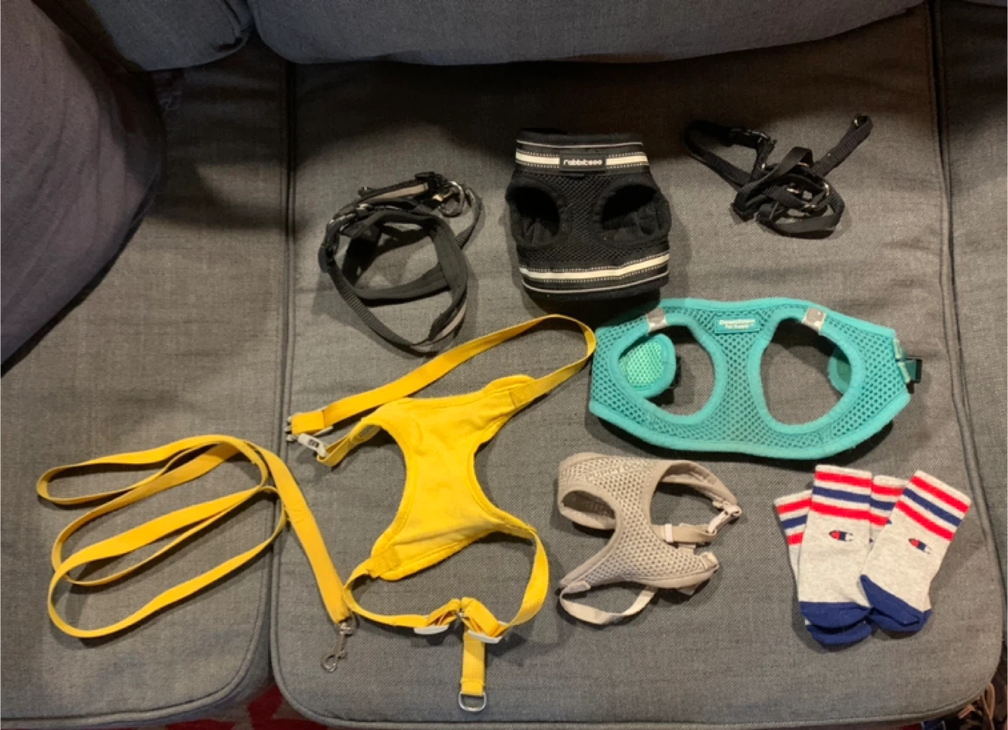 Selling a variety of dog harnesses! There's a Downtown Pet Supply harness in a nice teal colour, a Rabbitgoo harness in black, and another harness with 'Puppy Dog' on it in a light grey colour. Great for walks around the neighbourhood! All for a puppy or small dog. My girl outgrew them last year . Socks never used. 7 different harnesses all together .