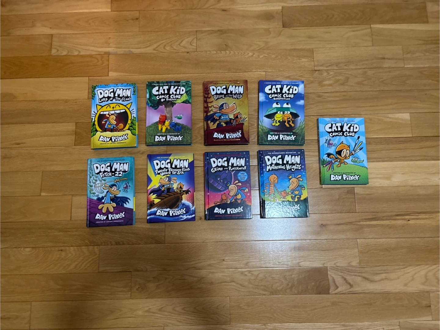 Selling a collection of Dog Man and Cat Kid Comic Club books by Dav Pilkey! Titles include Lord of the Fleas, On Purpose, Brawl of the Wild, Perspectives, Fetch-22, Twenty Thousand Fleas Under the Sea, Grime and Punishment, Mothering Heights
