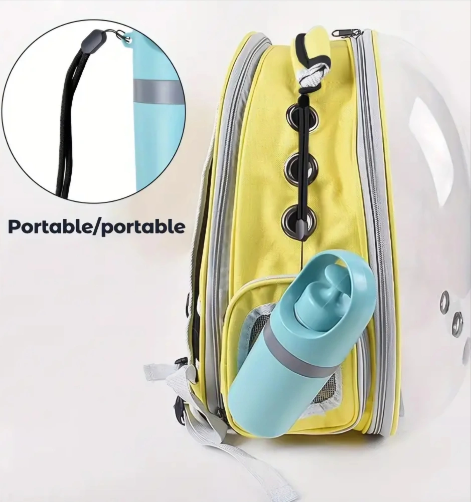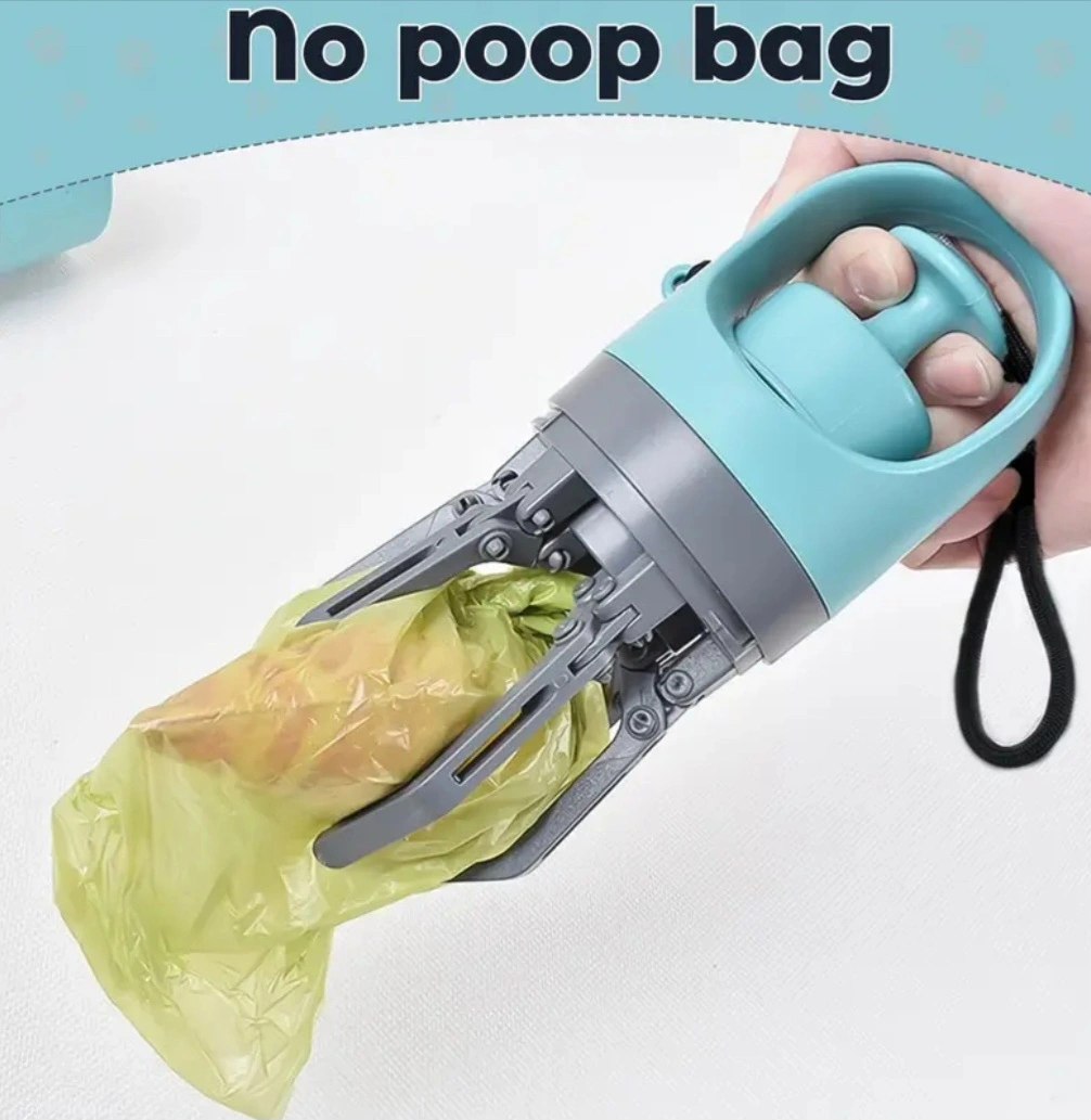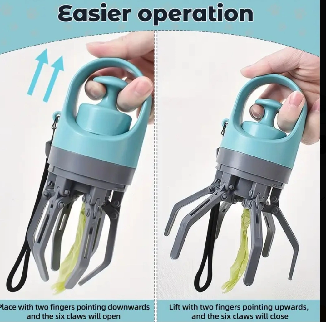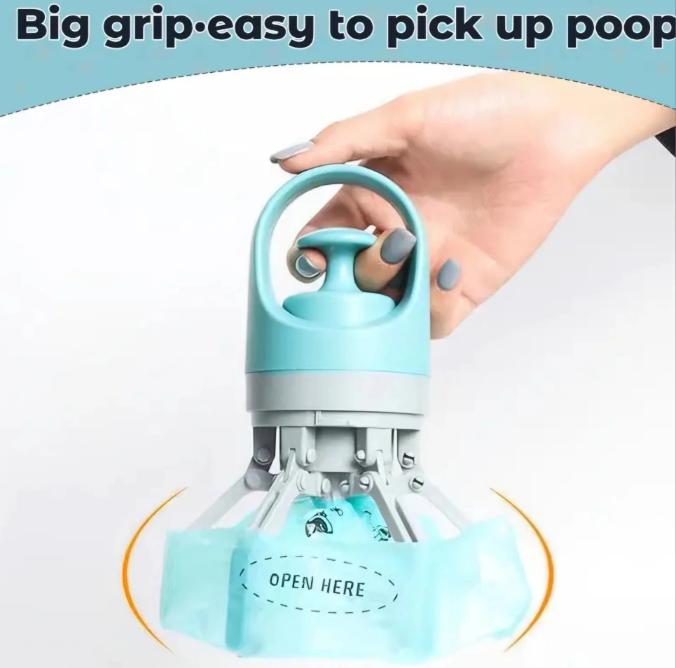Blue portable dog poop scoop with a handle. Features six metal claws to pick up waste. Comes with a carrying strap.
