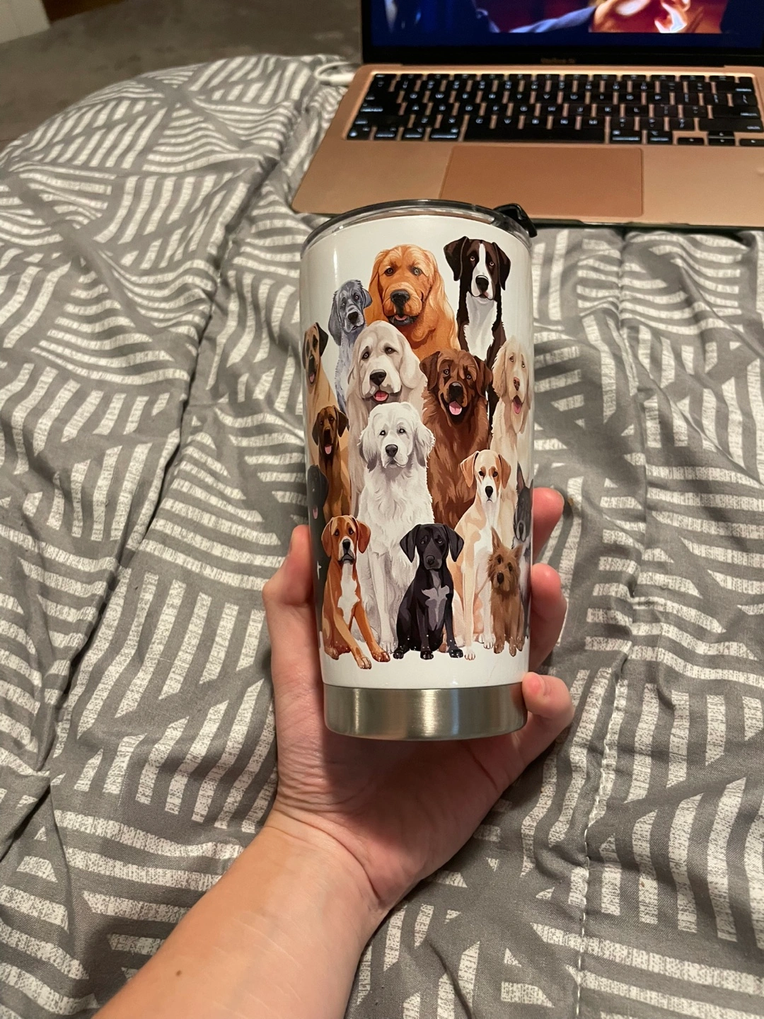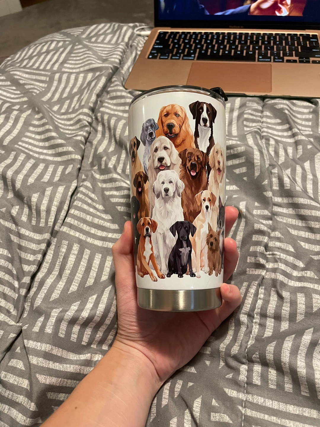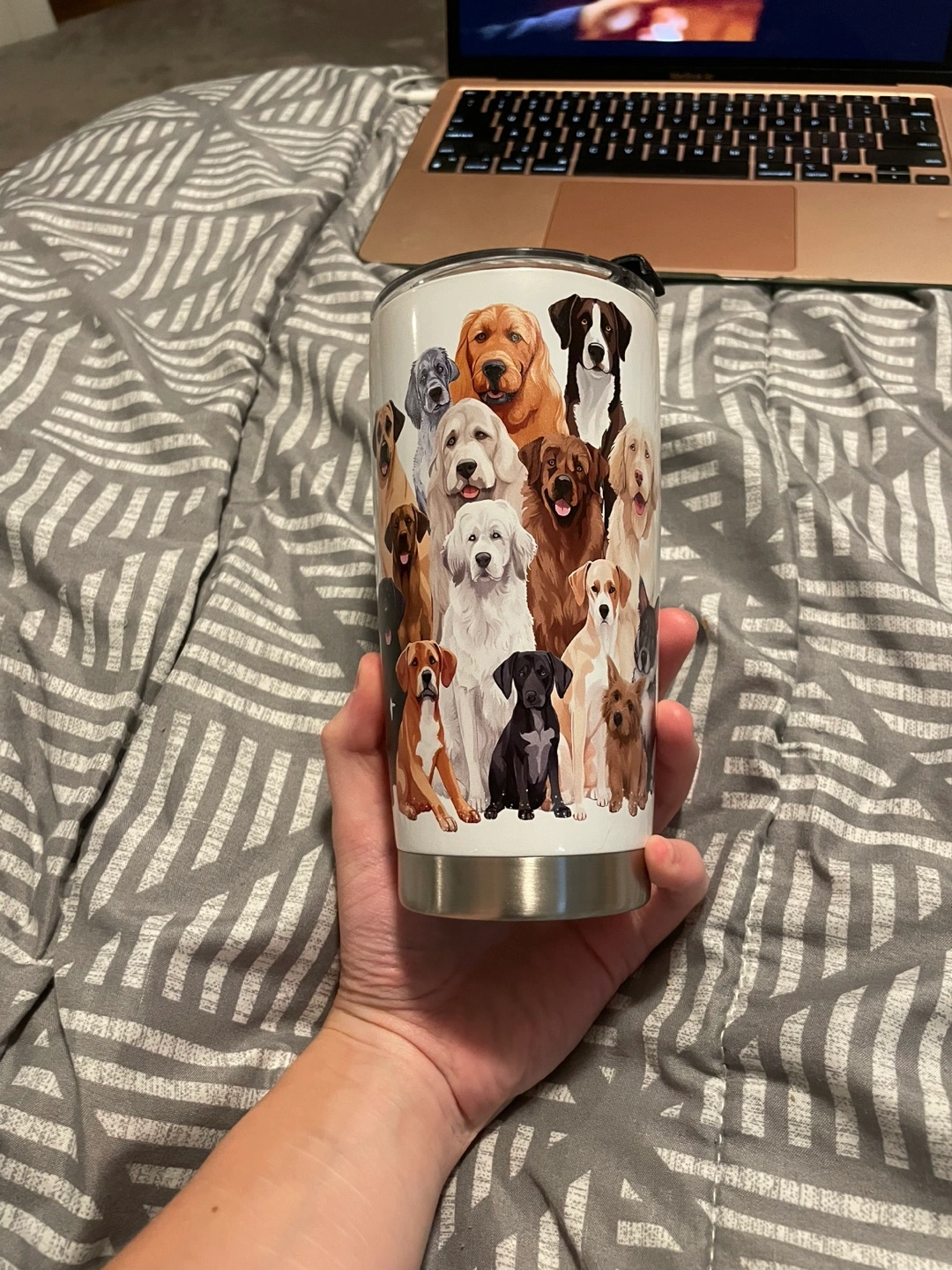 Show allTumbler with dog rescue theme. It has a stainless steel bottom and a design with many dogs on the side. The tumbler also has a text design that says, "I just want to rescue all the dogs".