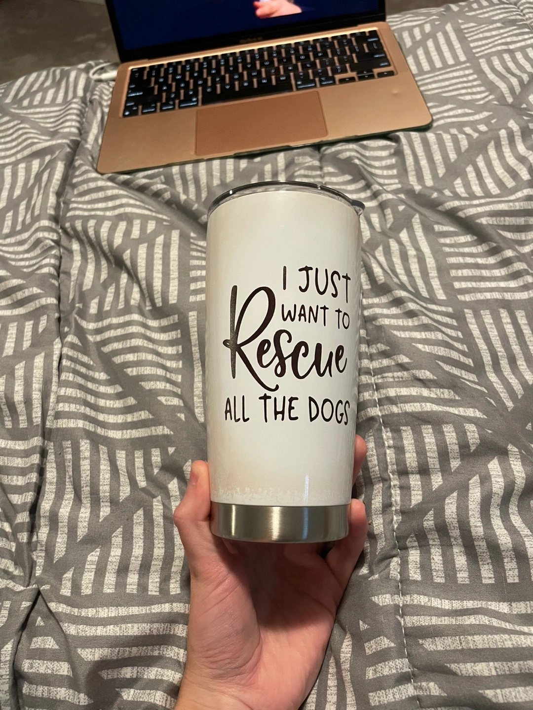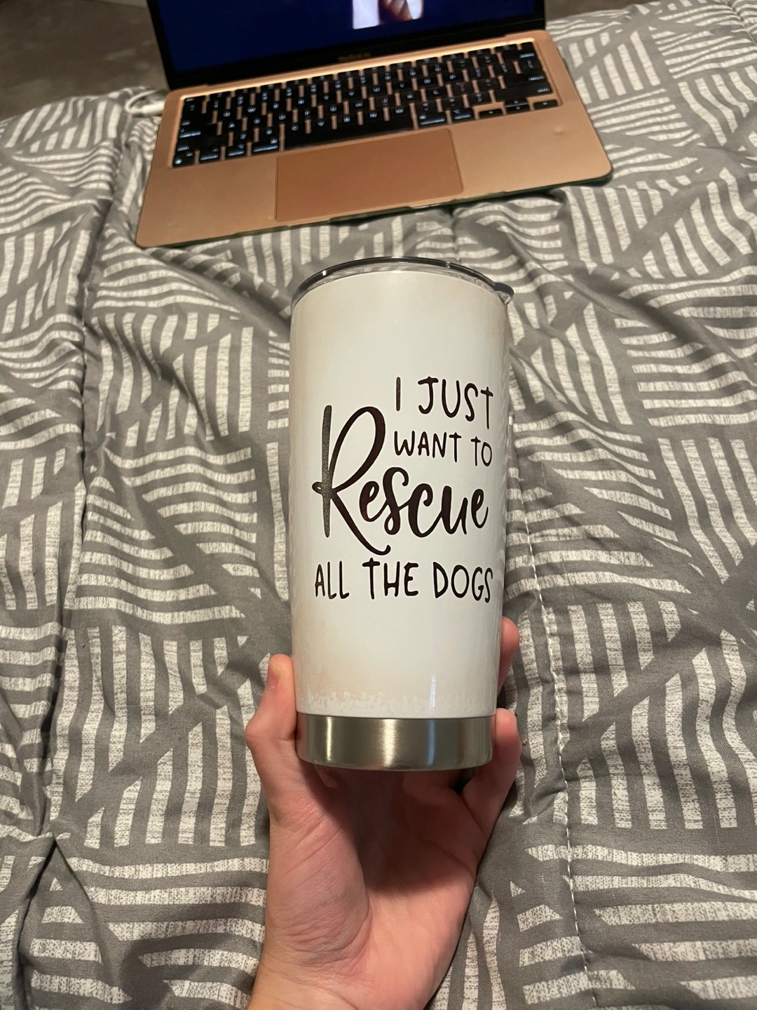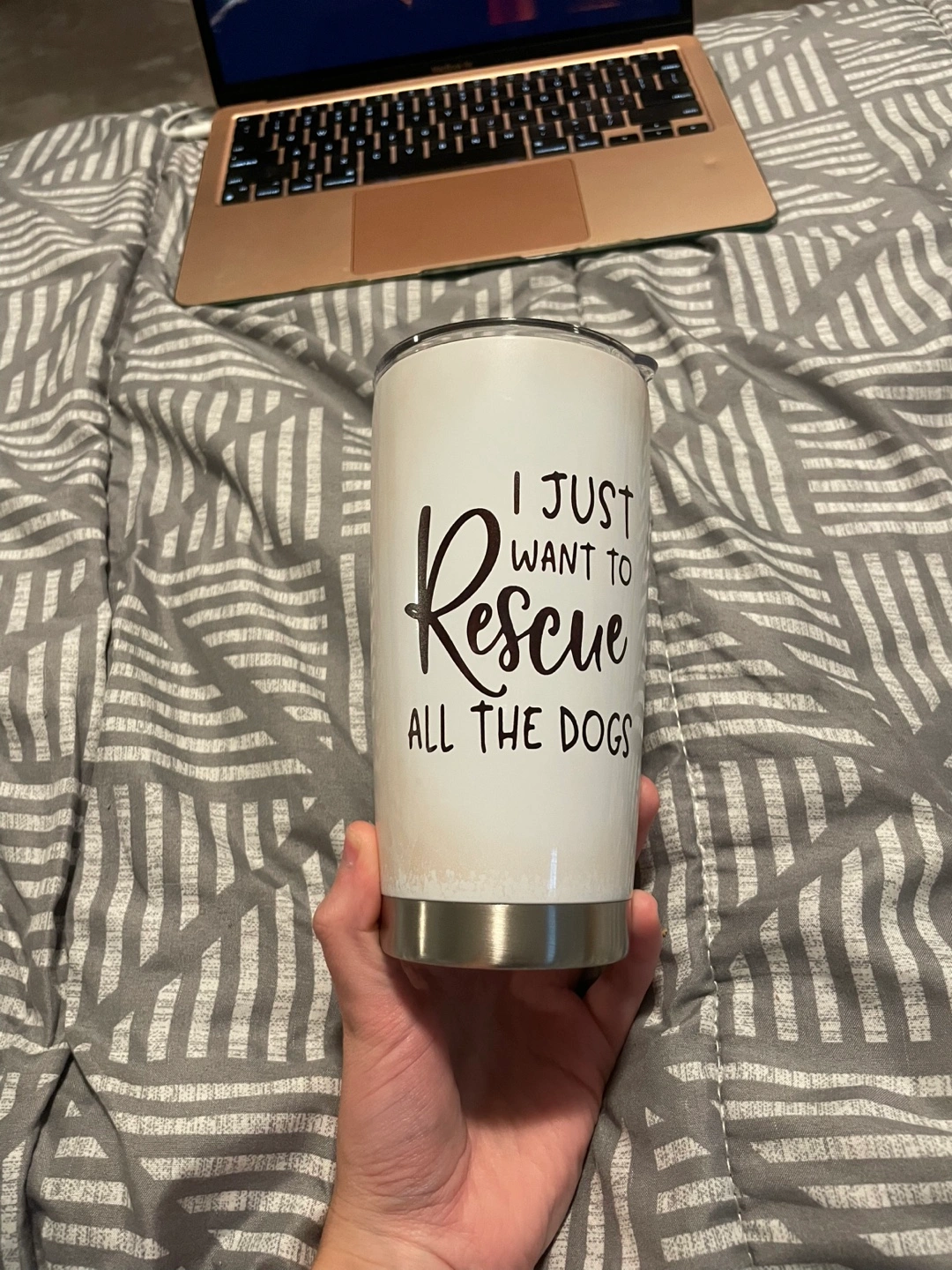 Tumbler with dog rescue theme. It has a stainless steel bottom and a design with many dogs on the side. The tumbler also has a text design that says, "I just want to rescue all the dogs".
