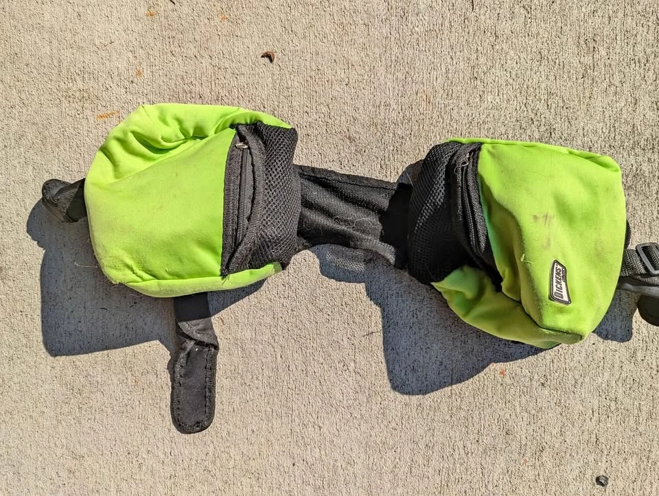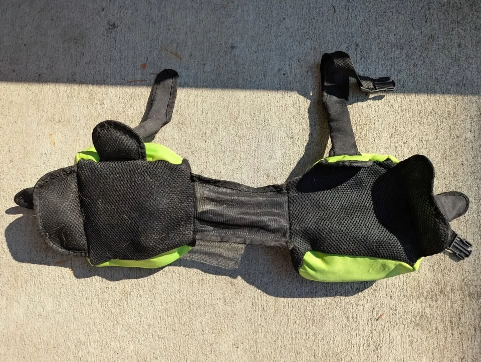 Dog saddlebag. Fits a medium to large dog. Fit our Belgian Malinois. Two zippers to carry water/food/treats for hikes or long walks. Great for active dogs if you add weight to give them bonus physical and mental exercise. Pick up near Vedder Way Walmart.