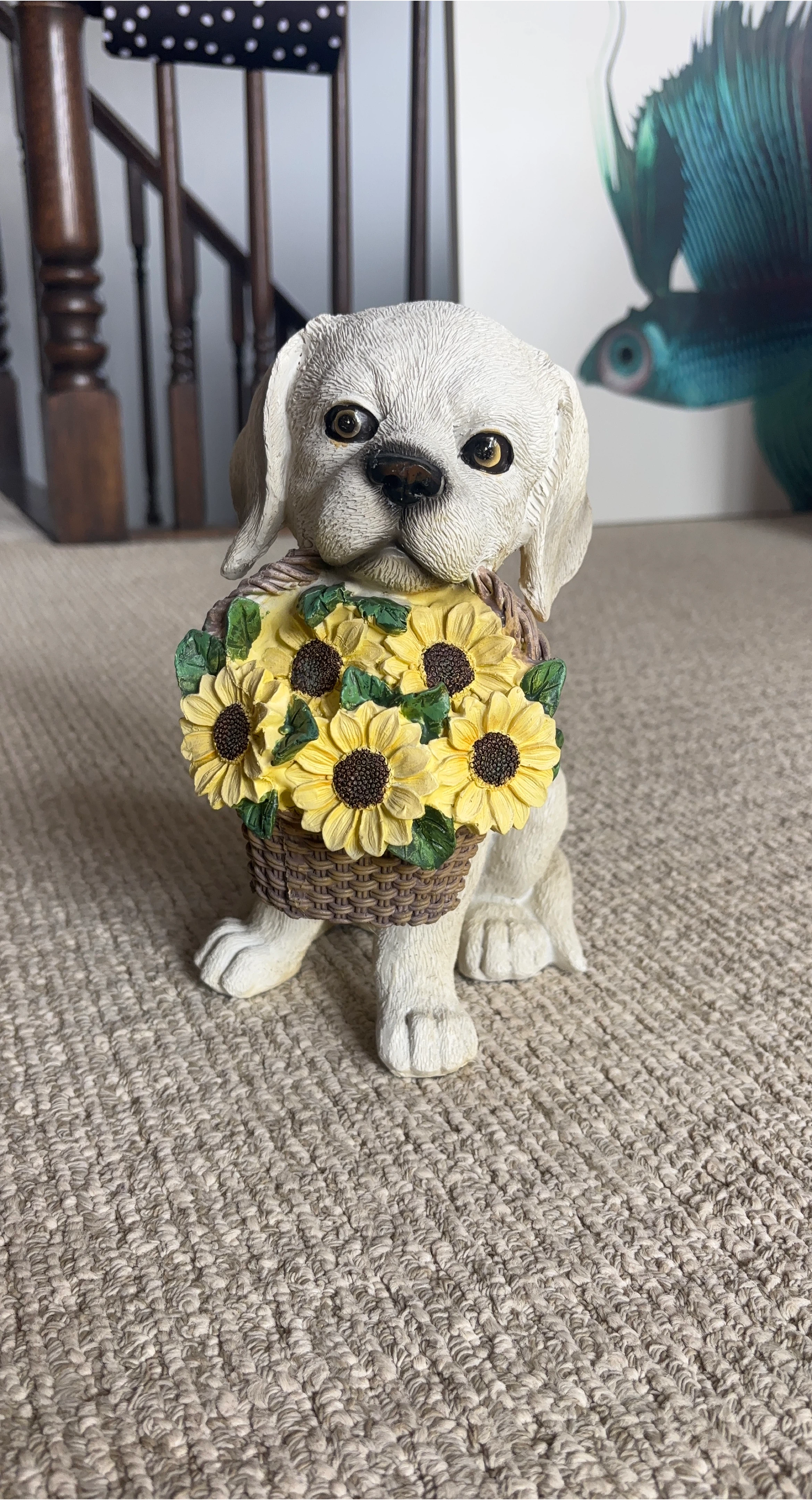 Selling a cute dog statue holding a basket of sunflowers! It's a charming piece for any dog lover or to add a touch of cheer to your home