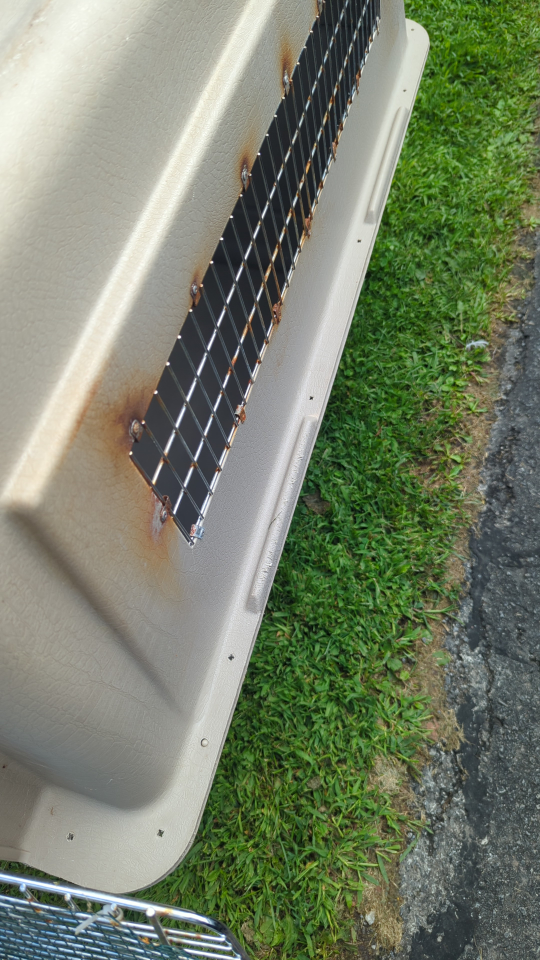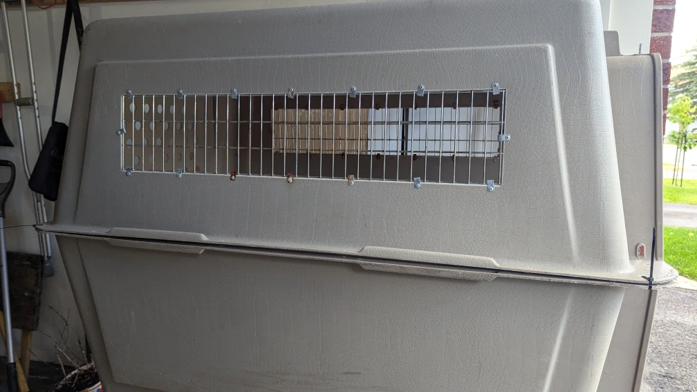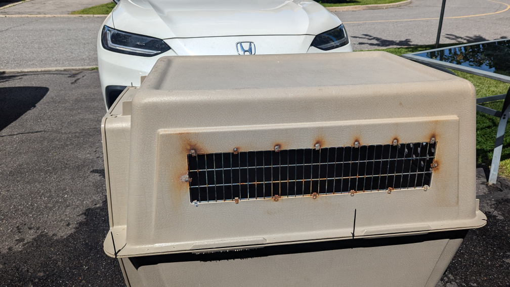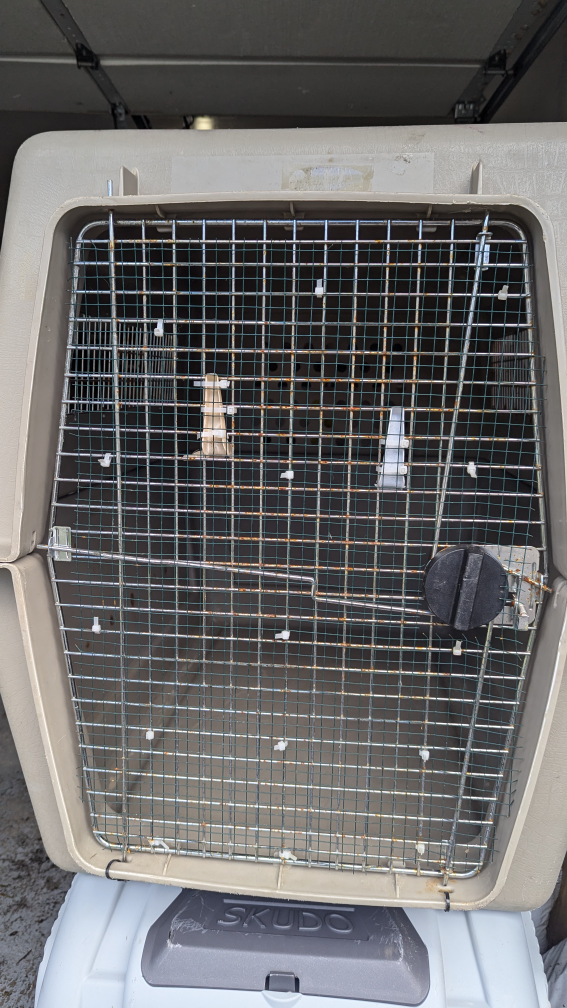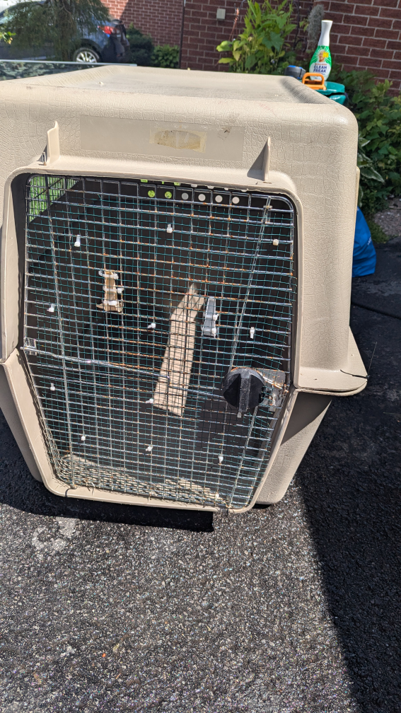A dog travel crate in OK condition. It has some rust on the metal grating. it will need hardware as well as it's kept together with zipties. 125 OBO