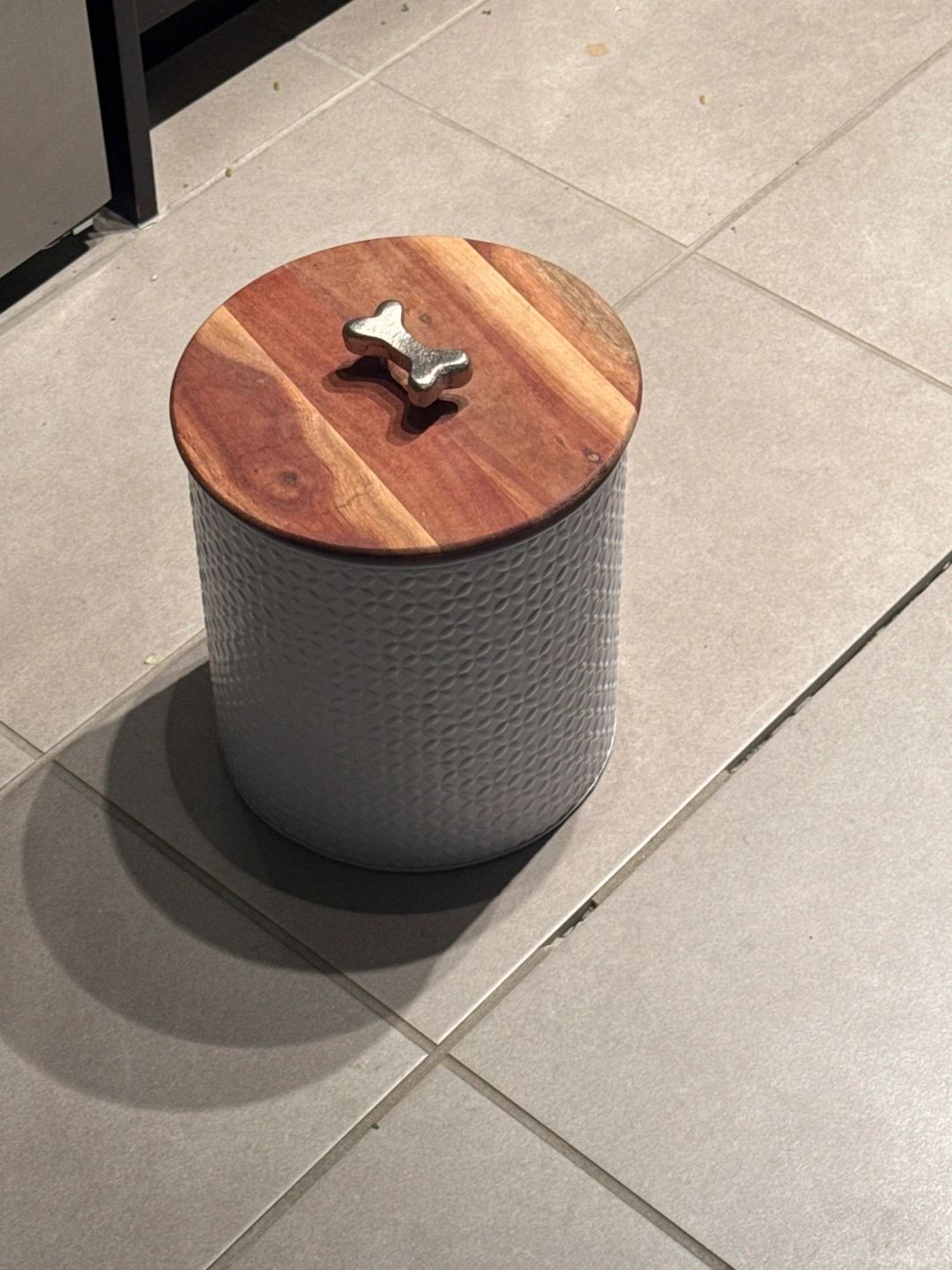 A cute dog treat canister with a wooden lid and bone-shaped handle! It's in good condition and perfect for keeping your furry friend's treats fresh and accessible.