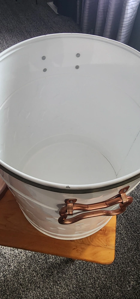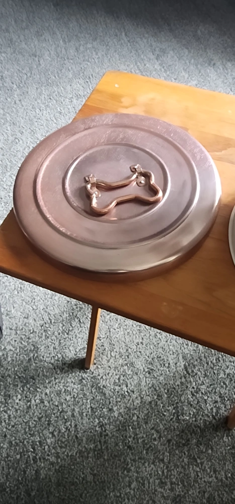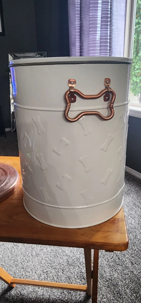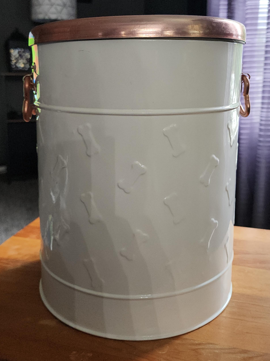 This is a cute dog treat container with a bone design. It's white with copper-coloured accents and handles. Perfect for keeping your furry friend's treats fresh!