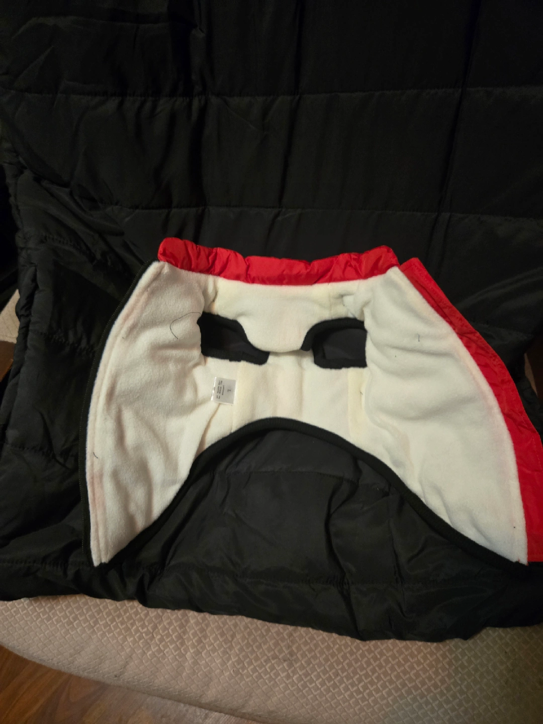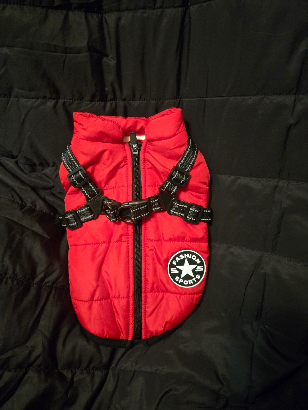 Keep your furry friend warm with this adorable red puffer vest! It's a size large dog 10 lbs and features a stylish "Fashion Sports" logo. The vest has a zipper closure and a harness attachment for easy walks. The inside is lined with a soft, cozy material for extra comfort