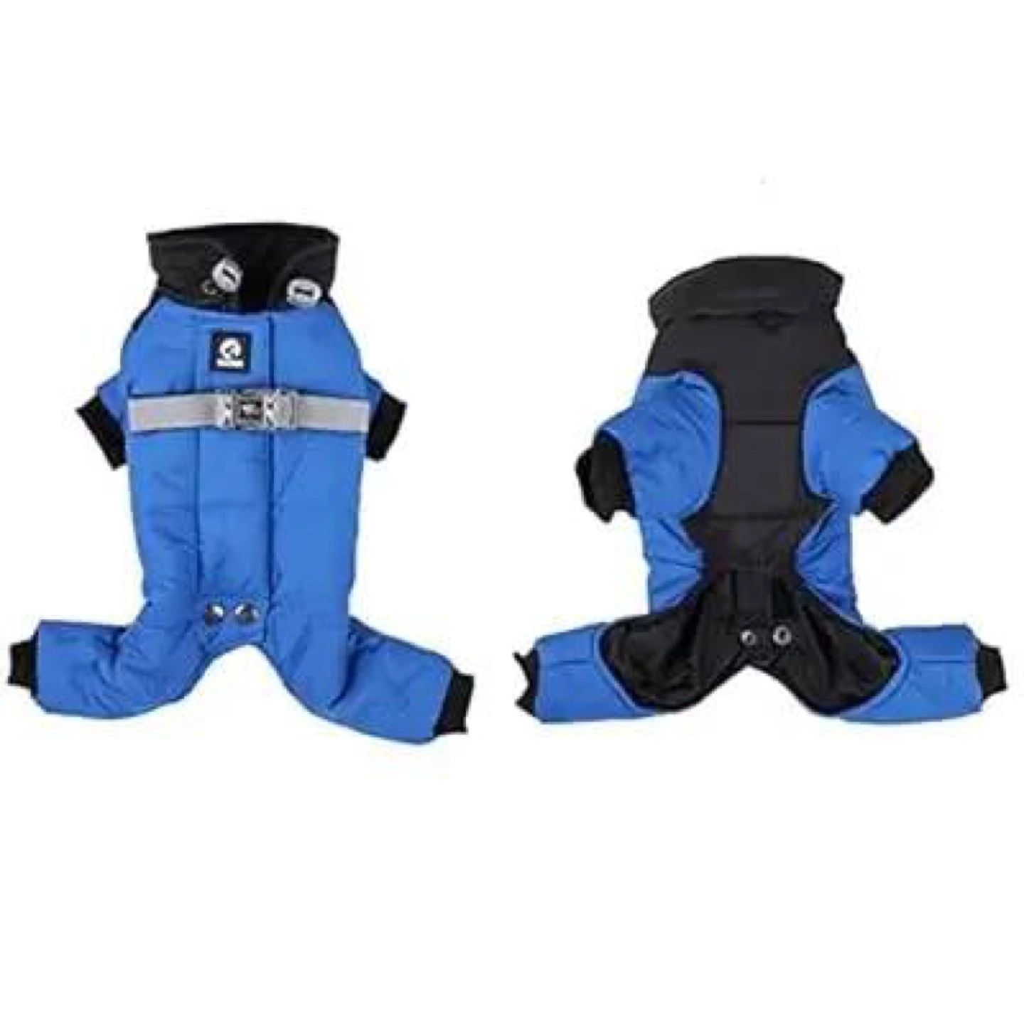 Warm, blue dog coat. Features a hood and belly coverage. Zipper and buckle closure. Perfect for cold weather. Size small.