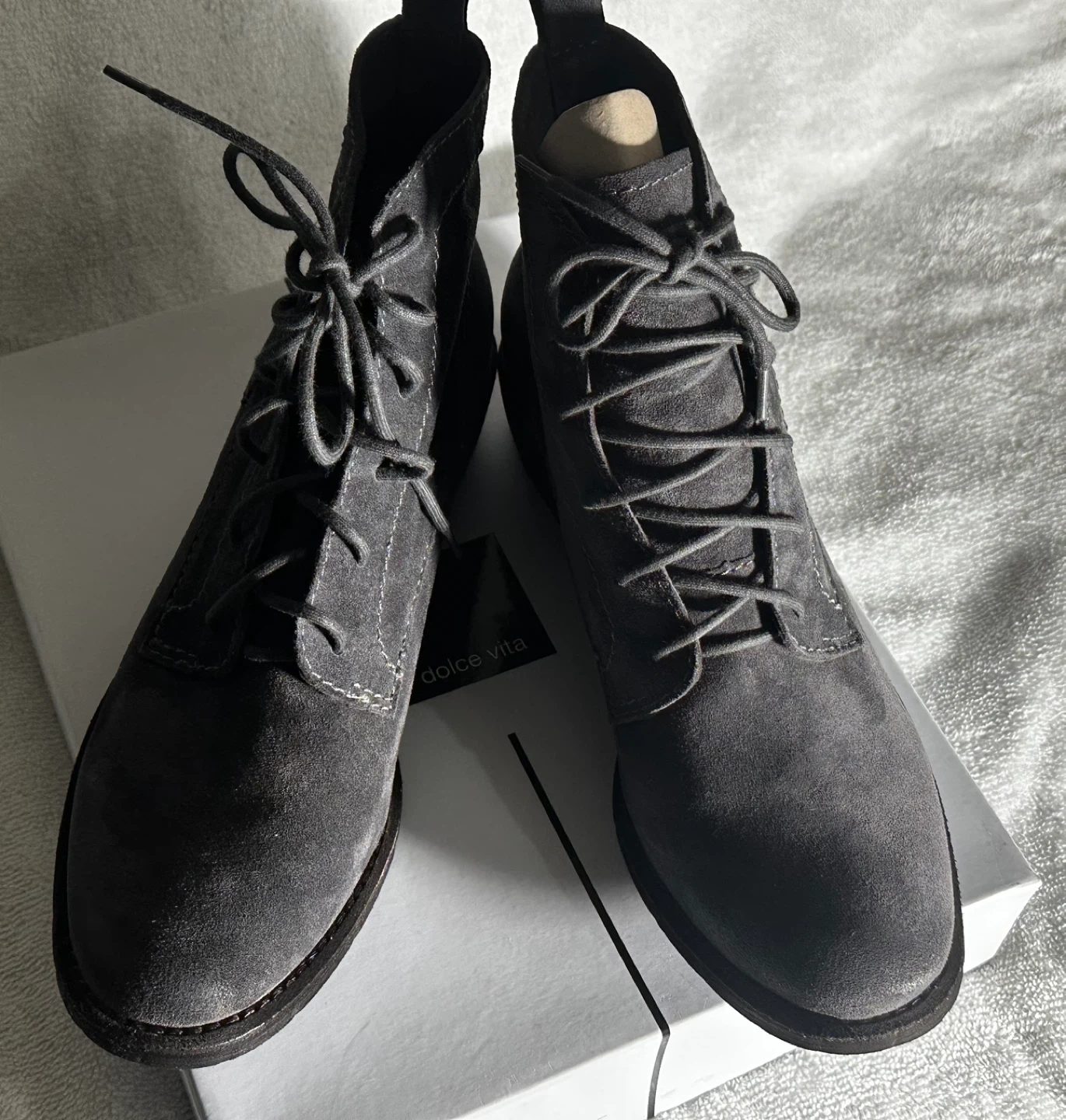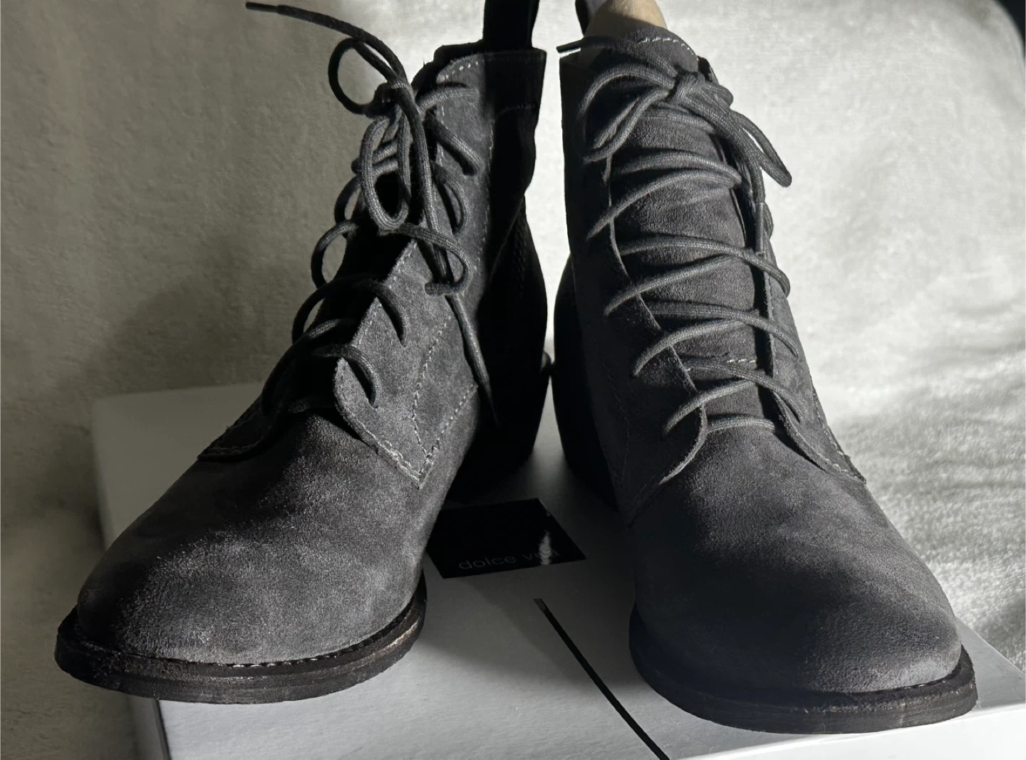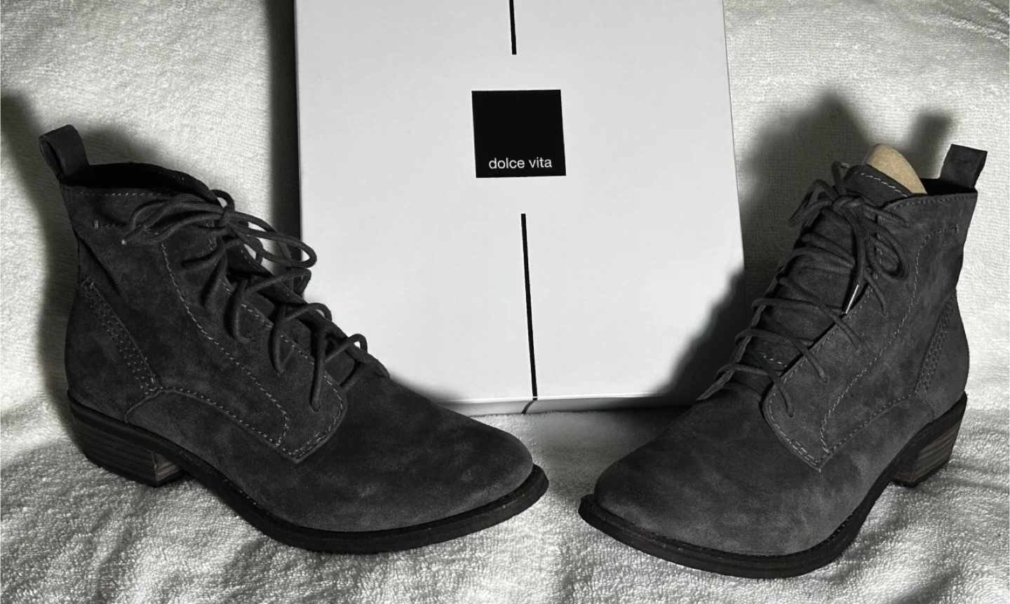 These are a pair of Dolce Vita lace-up boots in a lovely grey suede! They come with their original box. Perfect for adding a touch of style to any outfit. Never worn!