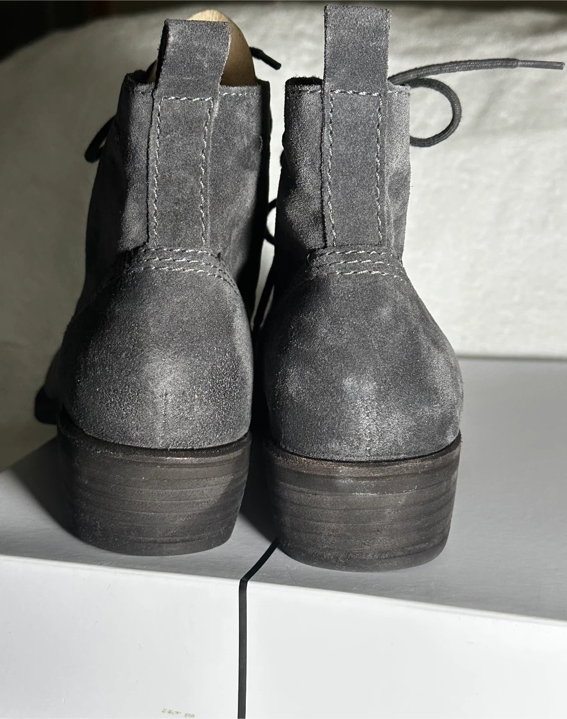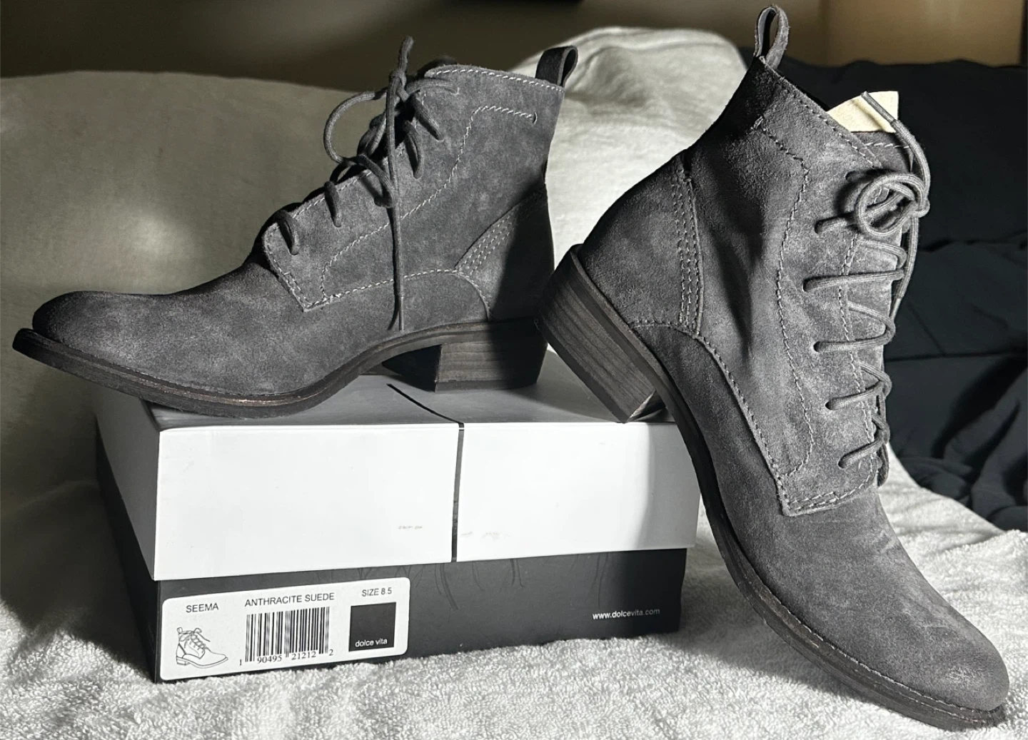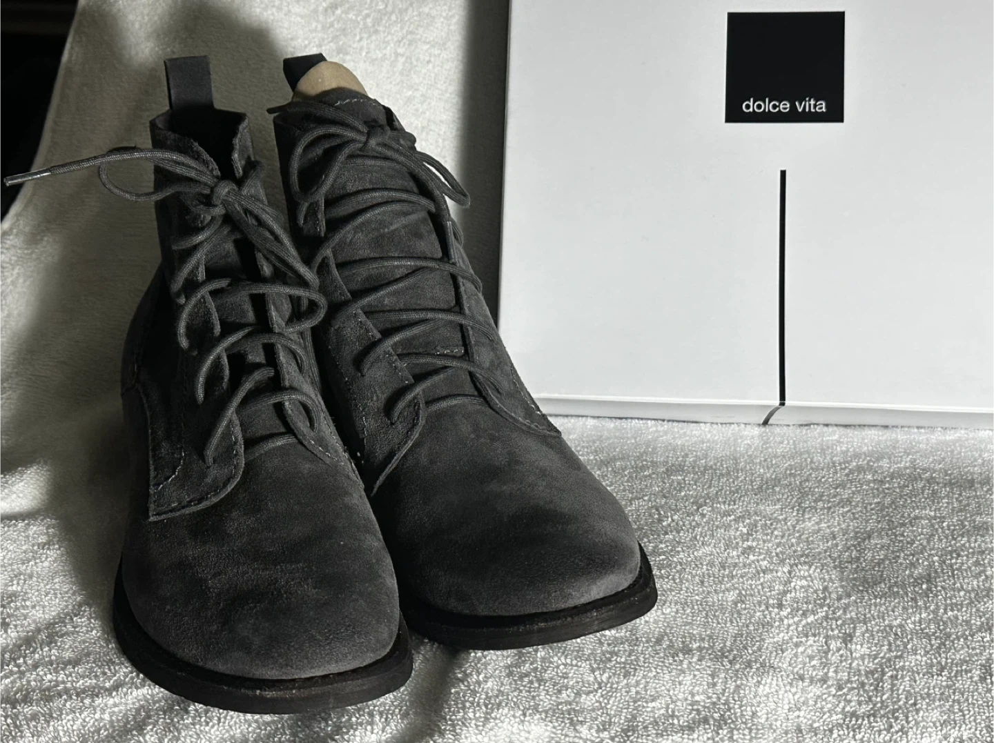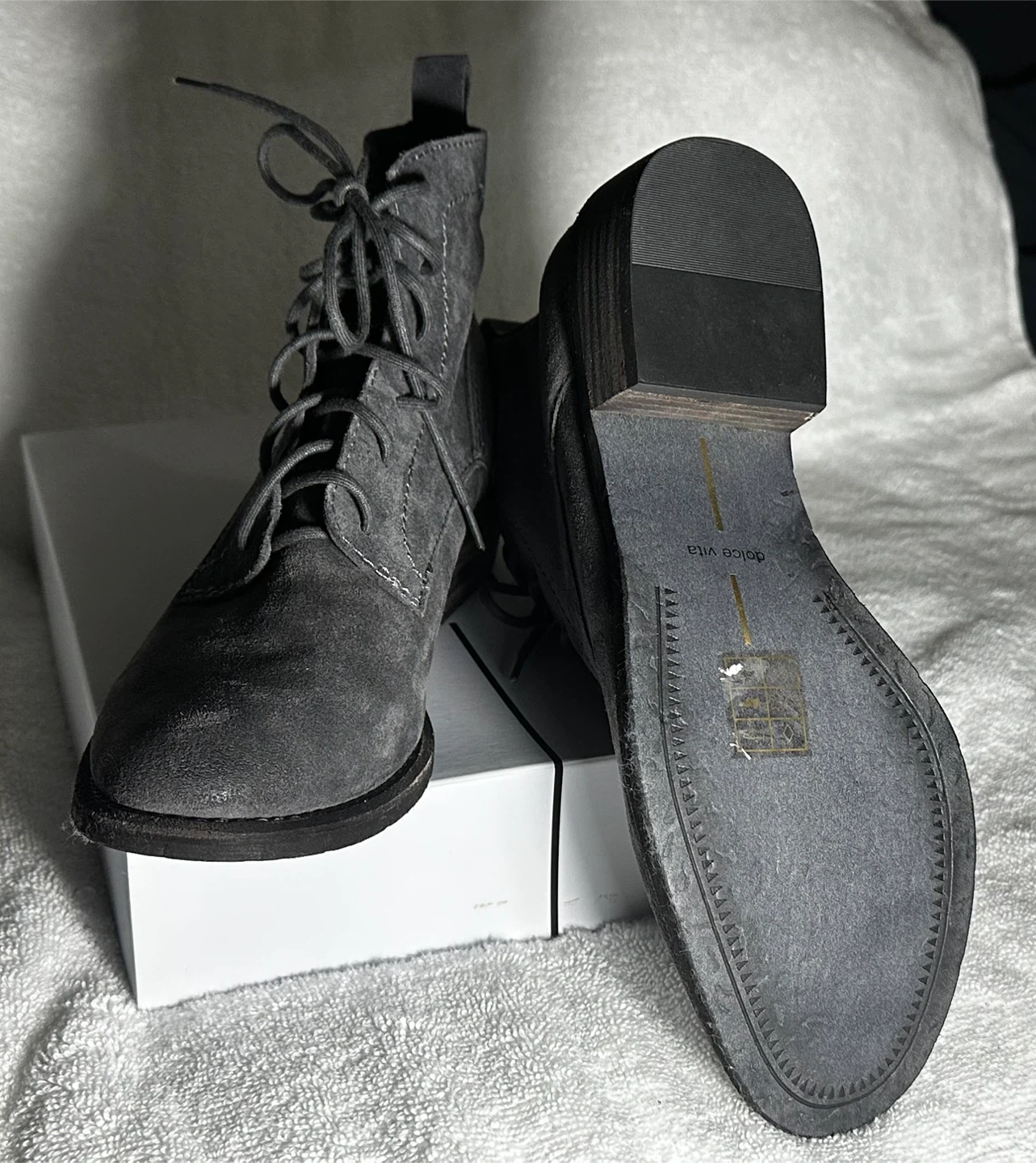 These are a pair of Dolce Vita lace-up boots in a lovely grey suede! They come with their original box. Perfect for adding a touch of style to any outfit. Never worn!