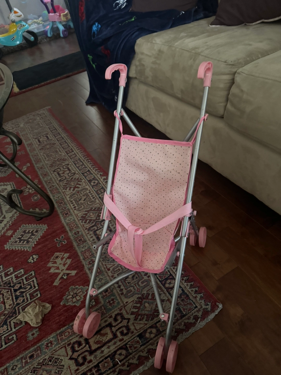 Adorable doll stroller. Pink fabric seat with silver frame. Compact fold design. Great for imaginative play.