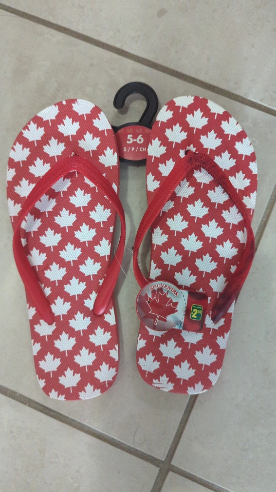 Cute Canadian-themed flip-flops, perfect for summer! They're red and white with a maple leaf pattern and are size 5-6