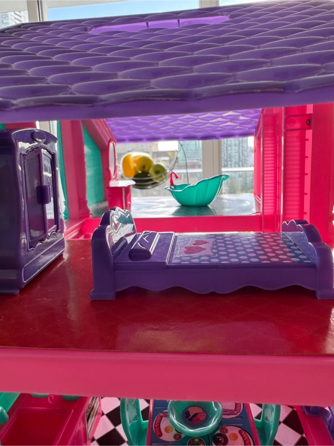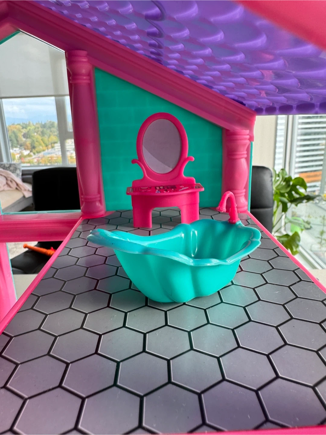 Selling a dollhouse that comes with furniture. It's in great shape and ready for a new home! Includes a car, people, couches, a bathtub, tables, chairs, and more