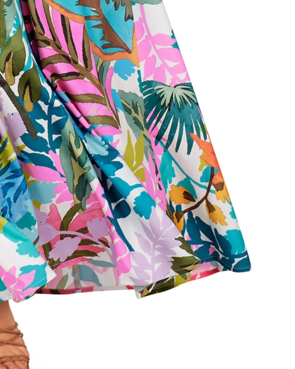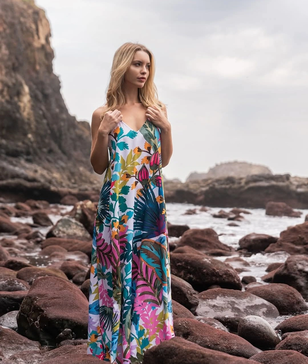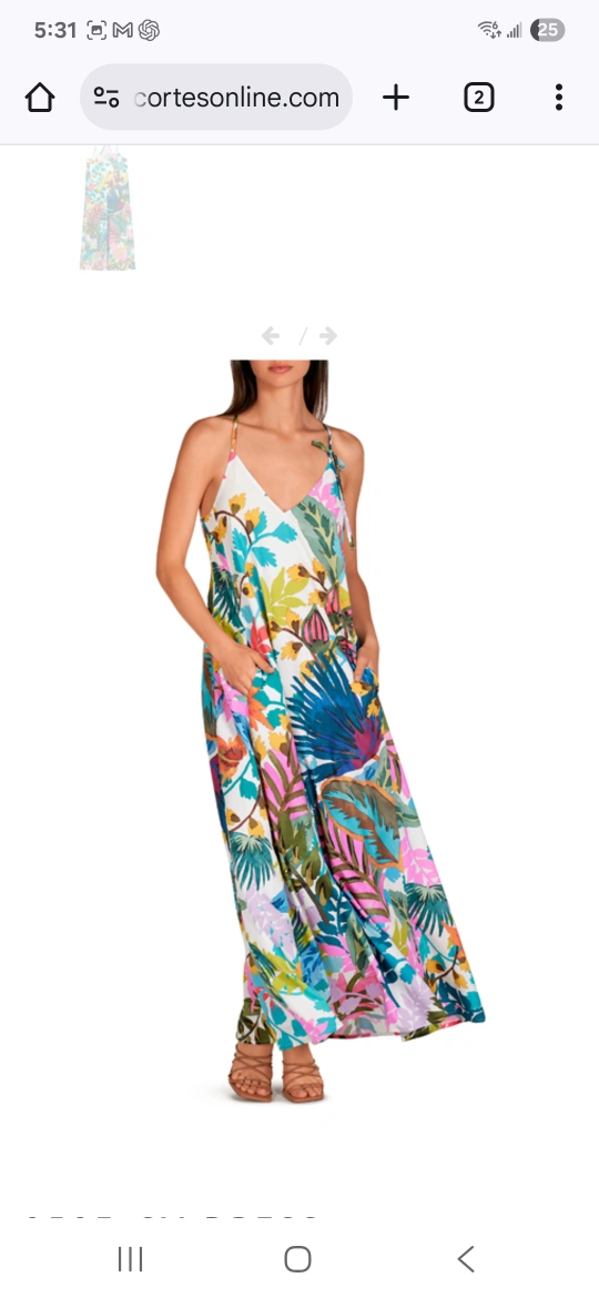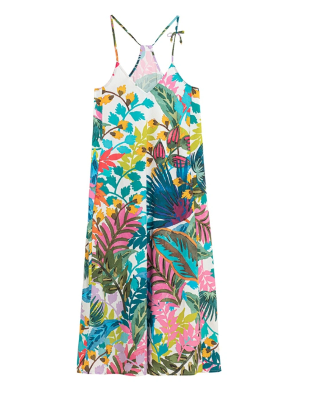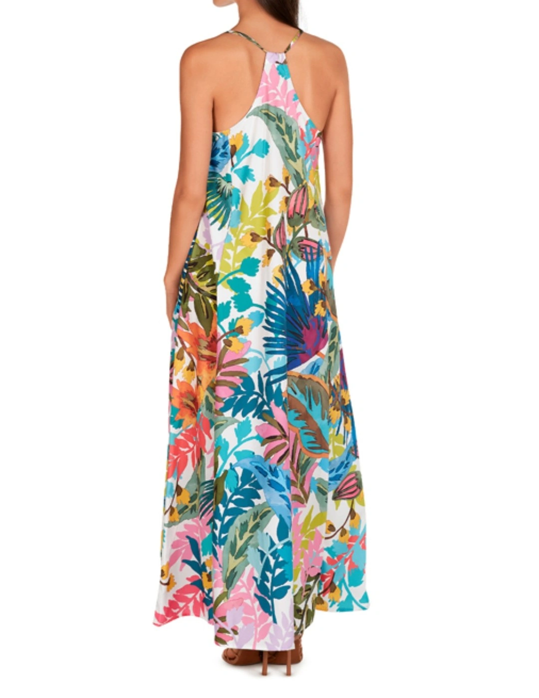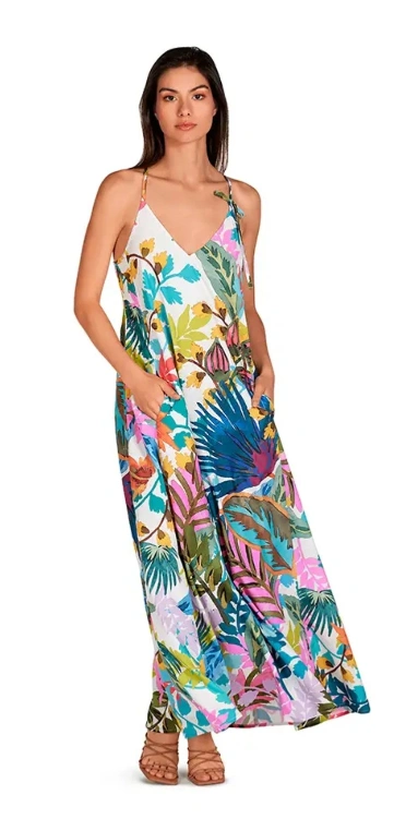 This beautiful DOLORES CORTÉS Farm Rio maxi dress features a vibrant tropical print on a white background. It has a flowy, comfortable fit, perfect for warm weather! The dress has a V-neckline and adjustable straps. It also has pockets!