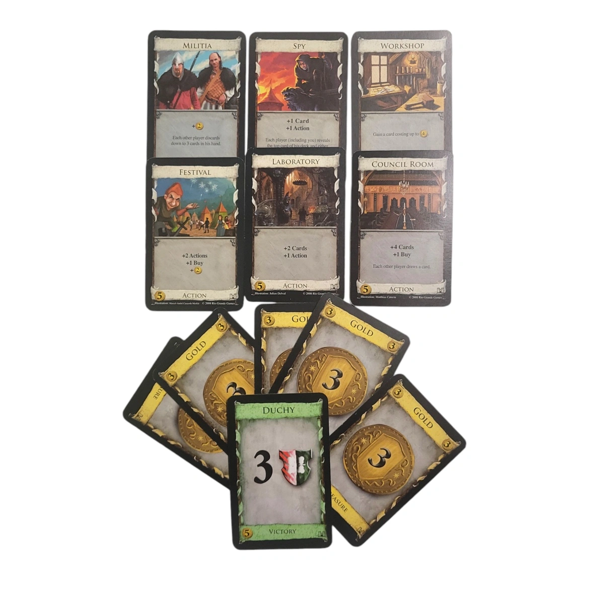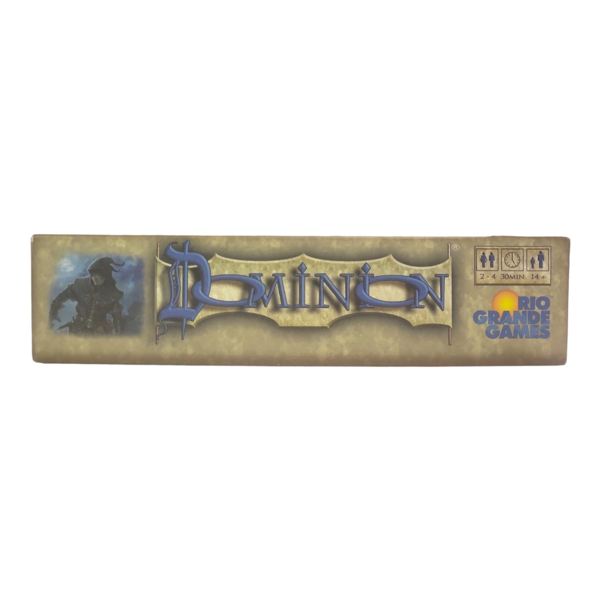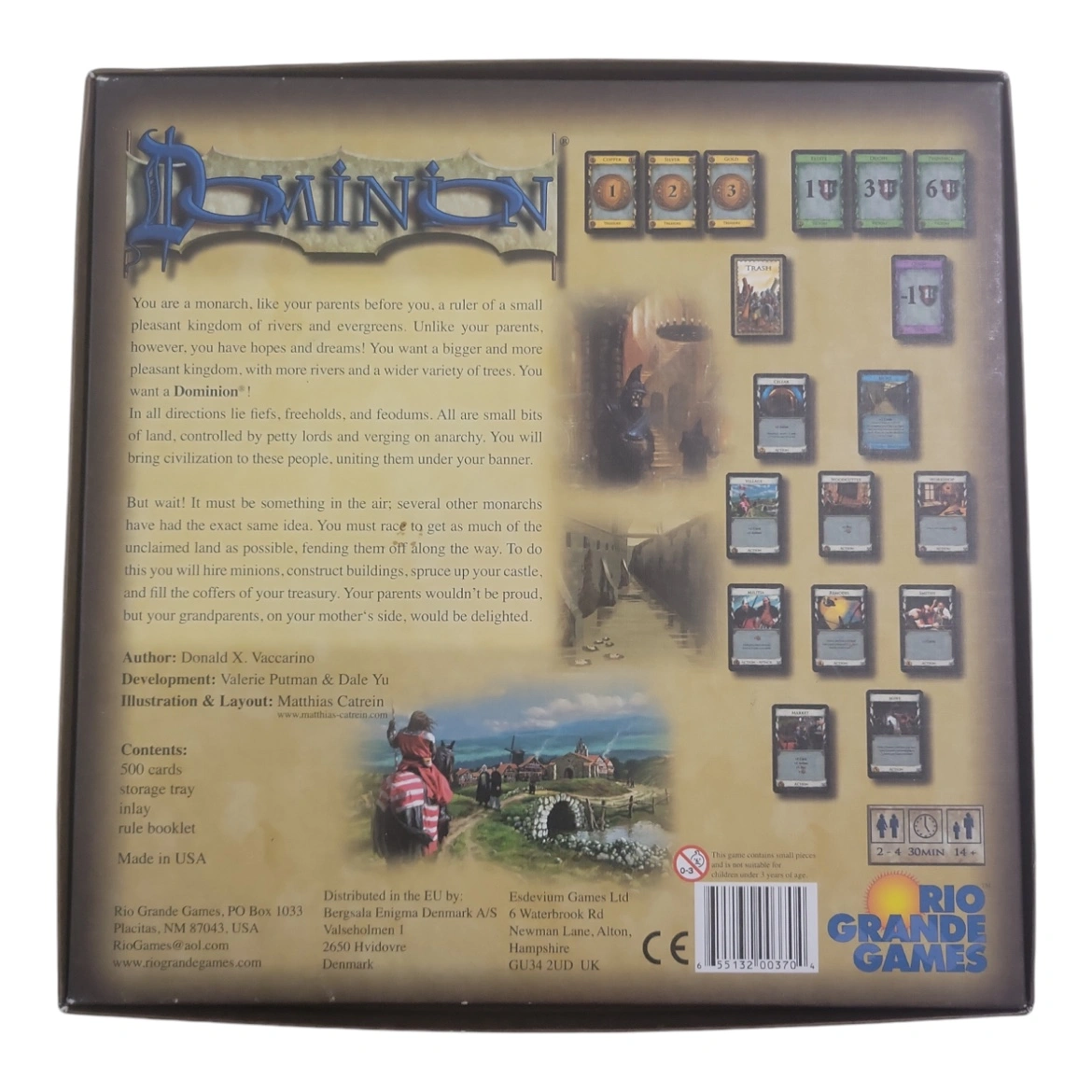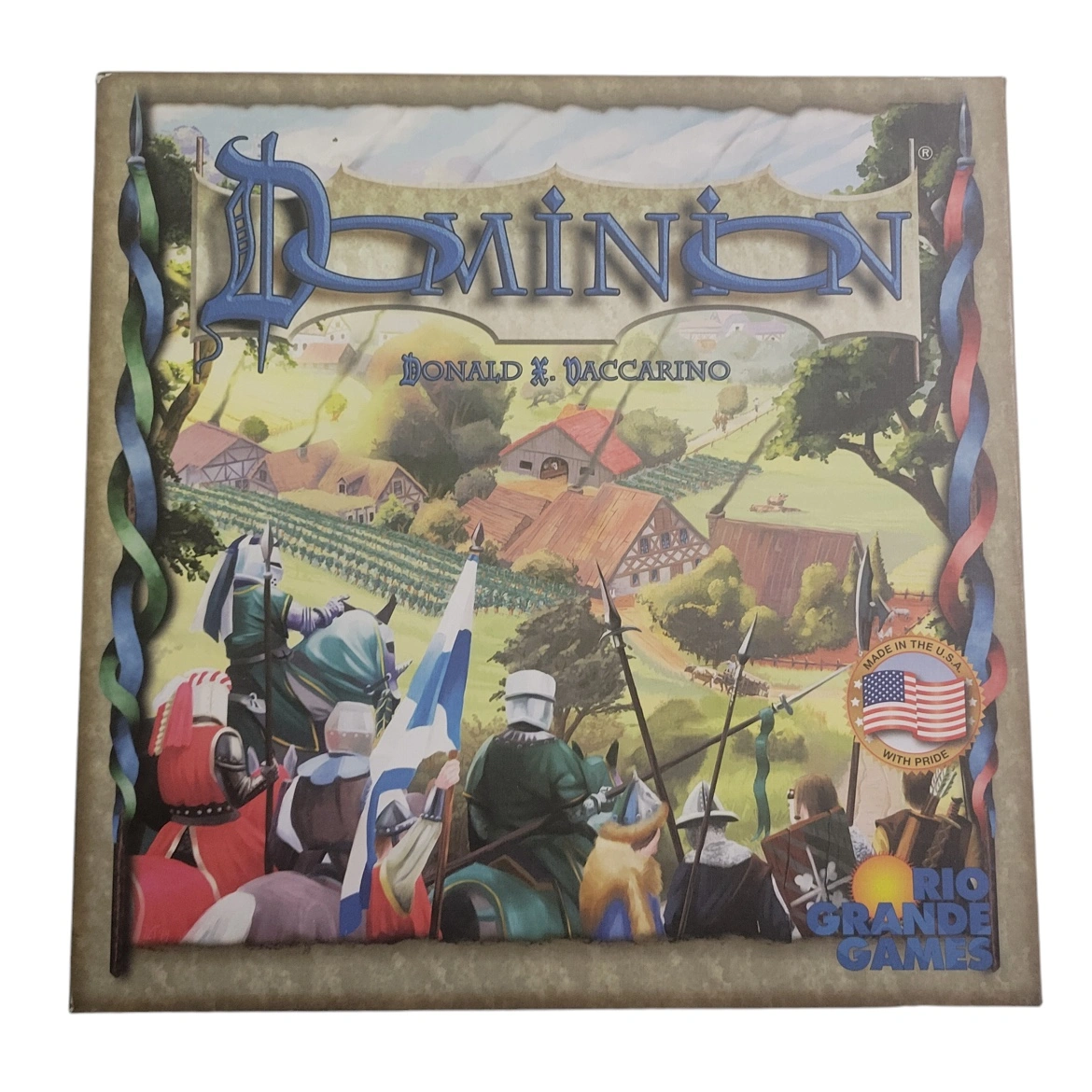 Dominion Card Game Gently used, no official rulebook included but printed copy inside In Dominion, each player starts with an identical, very small deck of cards. In the center of the table is a selection of other cards the players can "buy" as they can afford them. Through their selection of cards to buy, and how they play their hands as they draw them, the players construct their deck on the fly, striving for the most efficient path to the precious victory points by game end. Tags: card game game night play strategy
