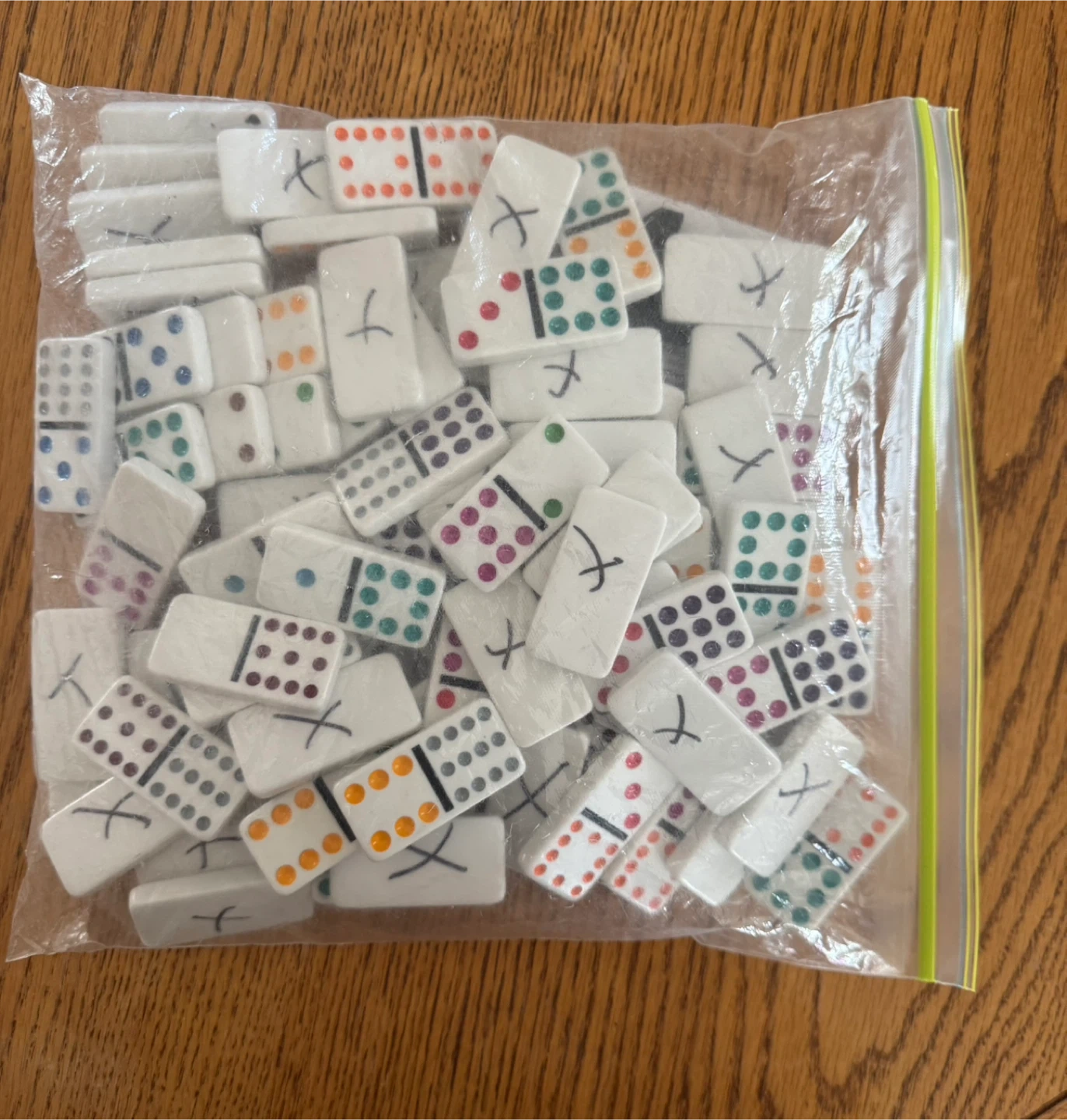 Dominoes set in a plastic bag. Great for family game night or to bring on vacation