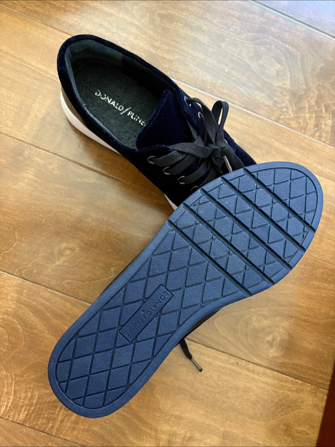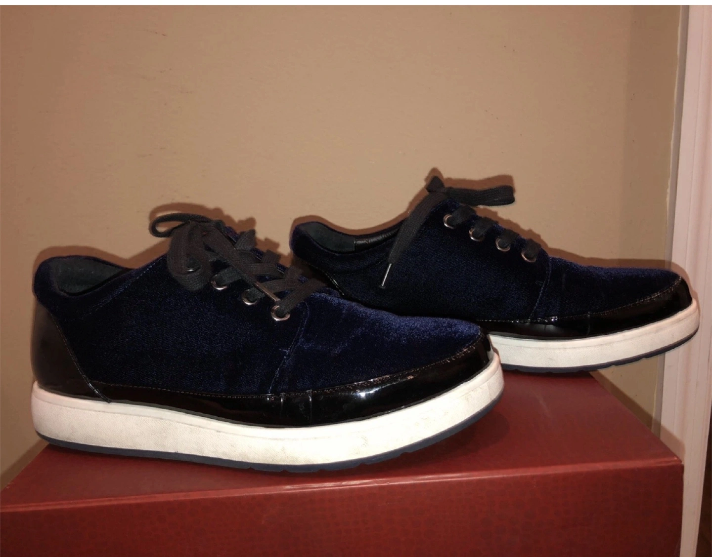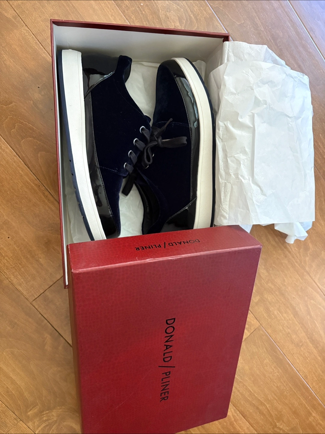These Donald Pliner Miranda sneakers are a stylish addition to any wardrobe! They feature a navy velvet upper with black patent leather accents and a white sole. Size 6.5. Comes with the original box!