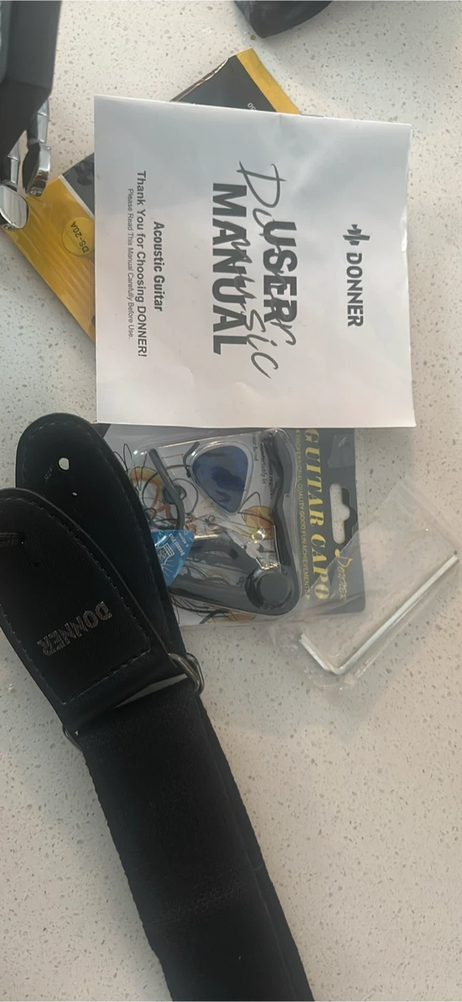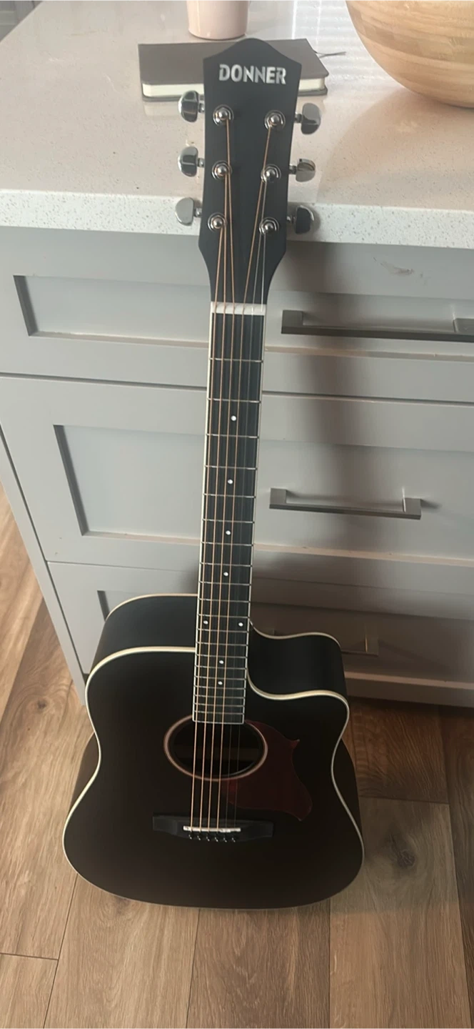 Selling a Donner 41-inch full-size acoustic guitar. It's in great condition and comes with a guitar case, user manual, guitar strap, guitar capo, and other accessories. Originally bought for $219.99.