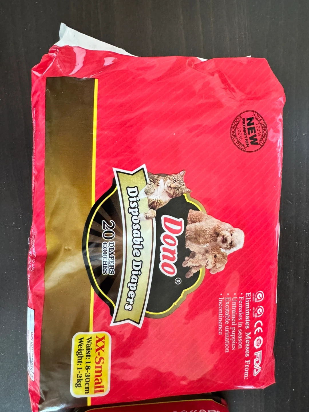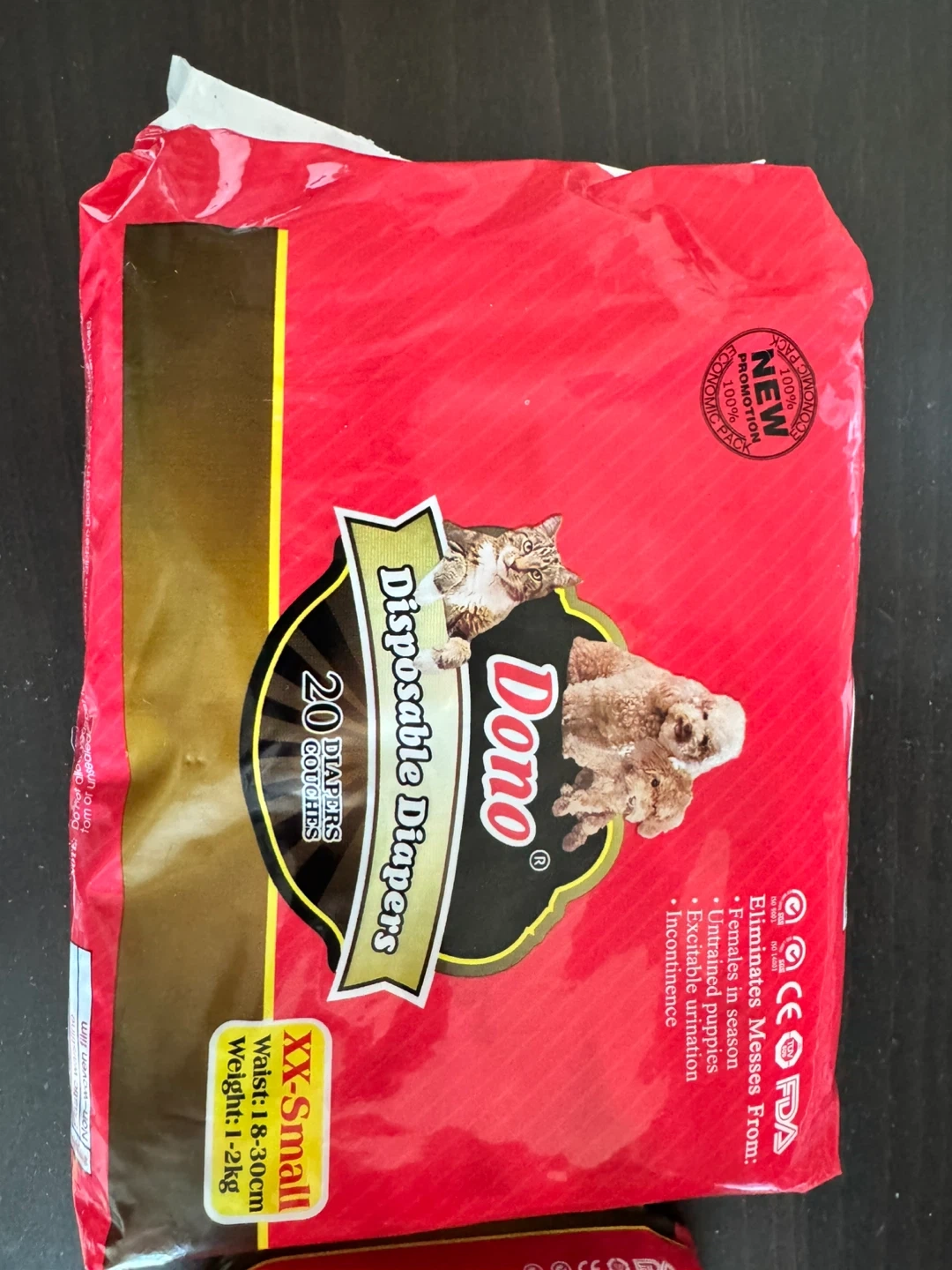 Selling a pack of Dono disposable diapers for pets. These are size XX-Small and each pack contains 20 diapers. They are suitable for pets with a waist size of 18-30cm and a weight of 1-2kg. Perfect for managing messes from females in season, untrained puppies, excitable urination, and incontinence
