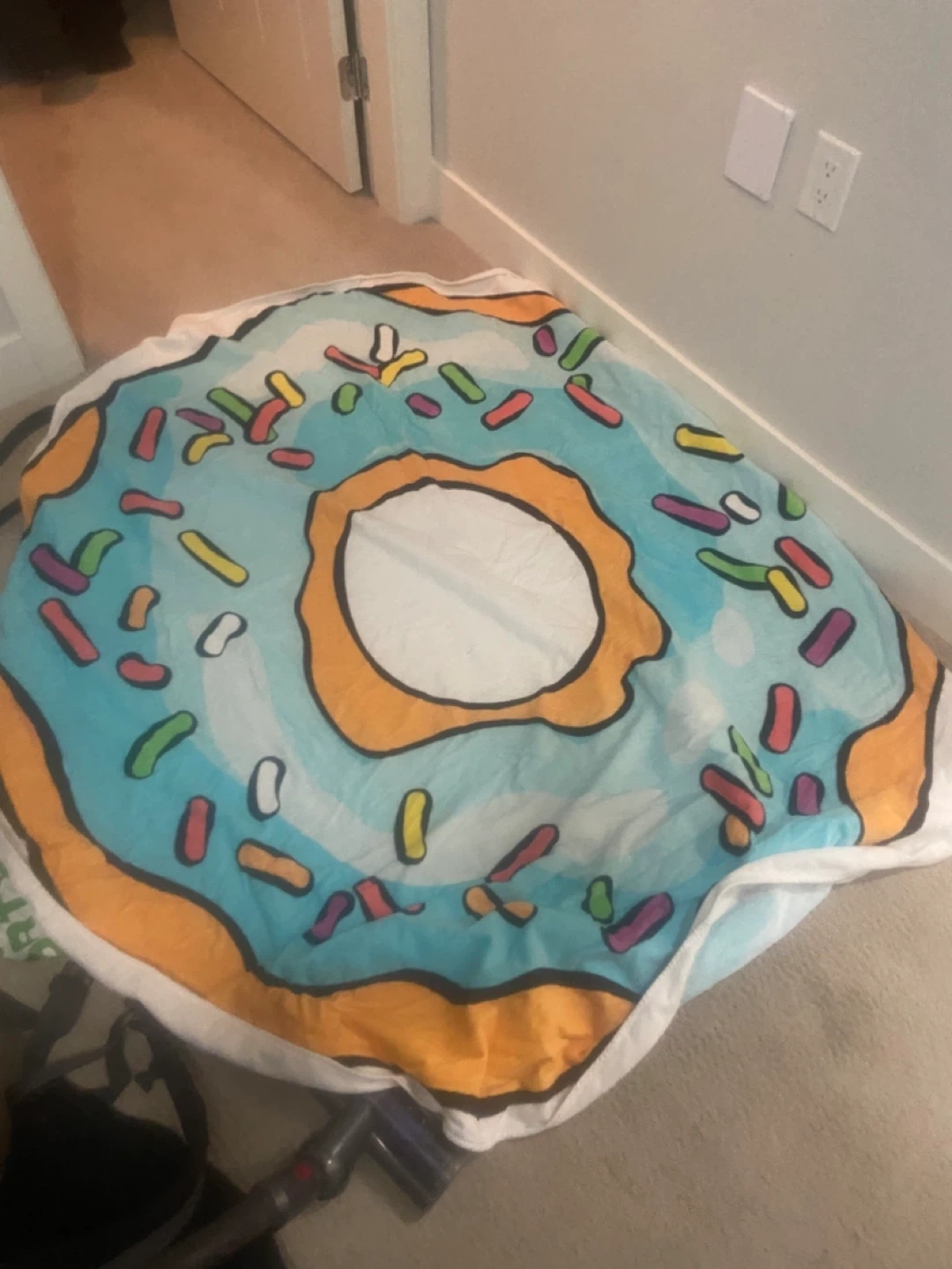 Selling a fun donut print round beach blanket. It's perfect for adding a touch of whimsy to your beach days or picnics in the park! The colourful design is sure to brighten up any outing
