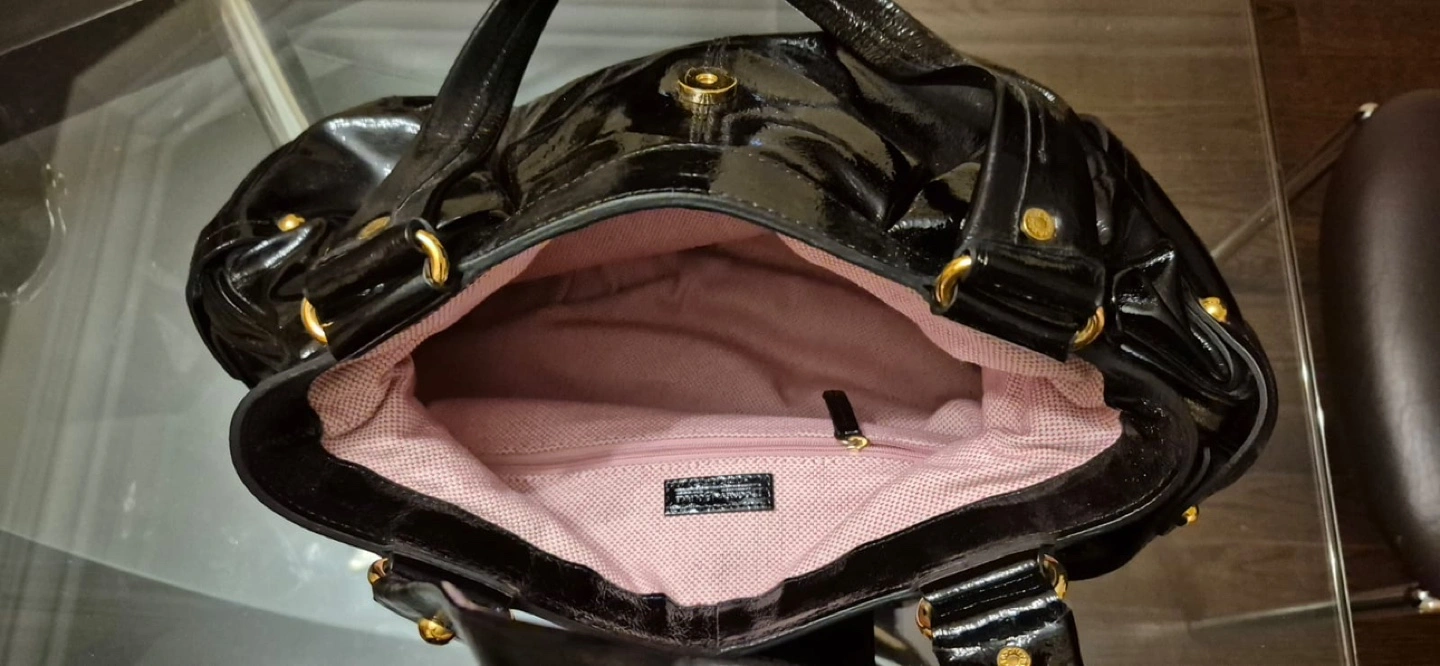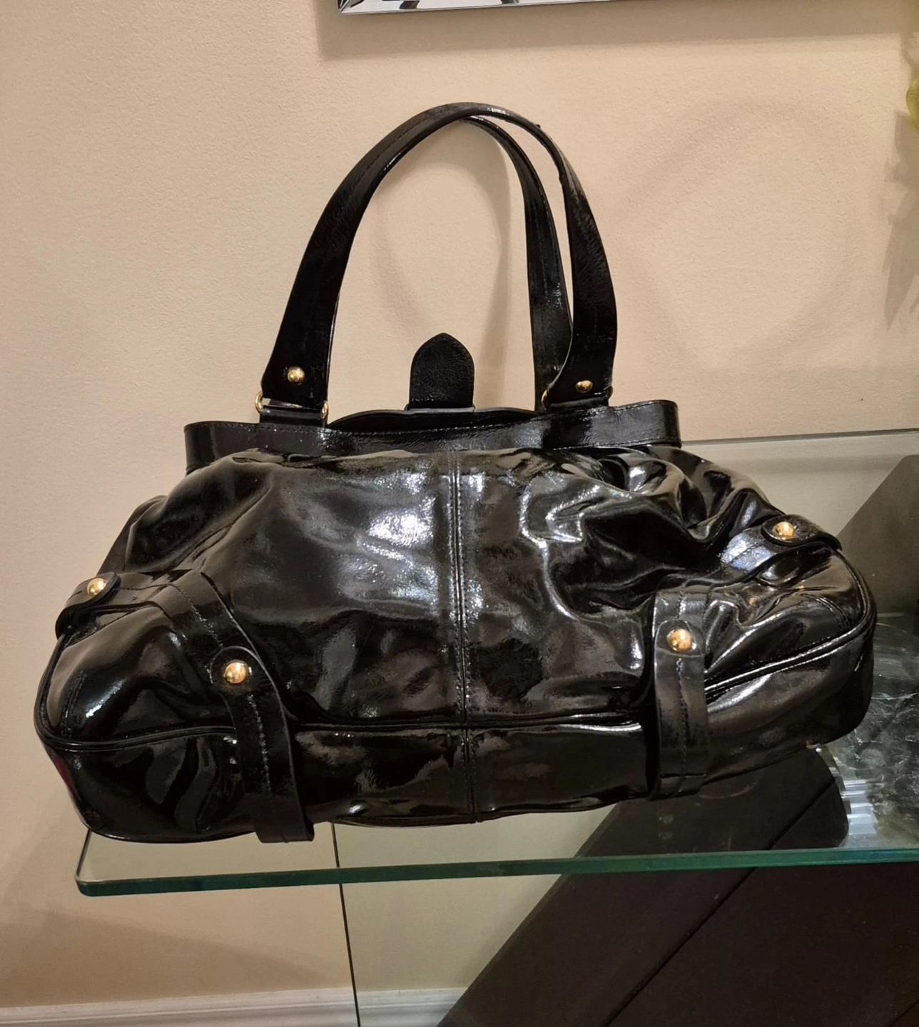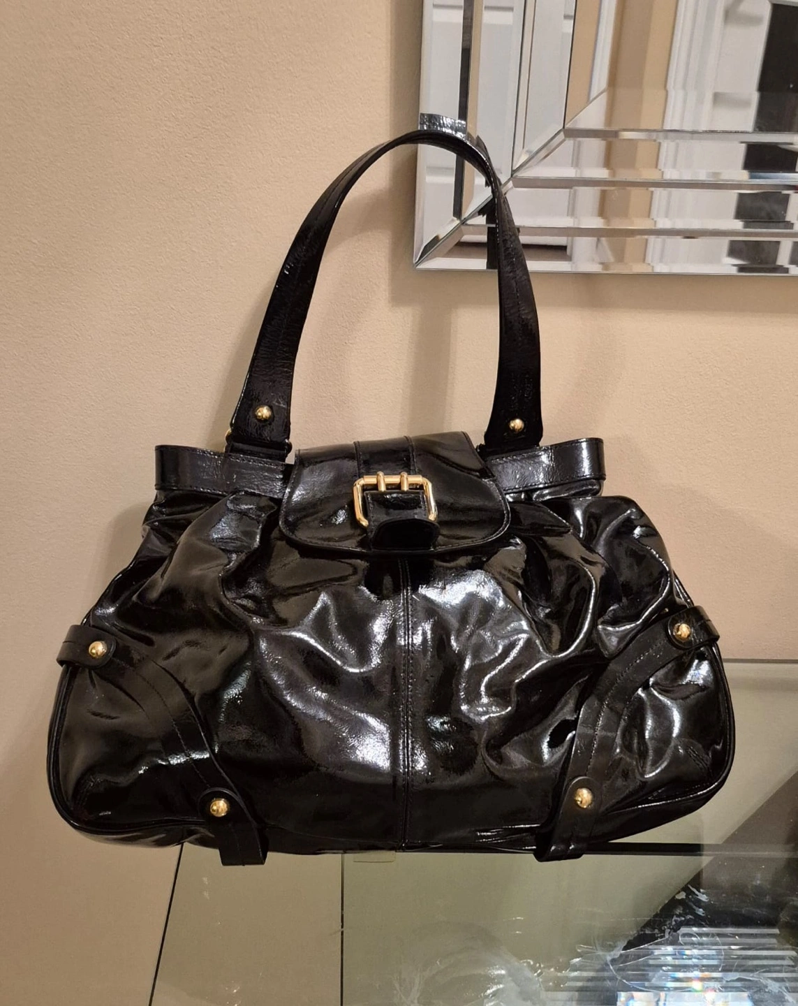 Vintage Dooney & Bourke HP Hayden Panettiere handbag! Limited Edition catching patent leather. Bag features puffy pleats, bold buckle closure. Double handle straps for shoulder or arm carry. Roomy interior with key clip, zippered pocket, and slip pocket in a classic pink check lining.