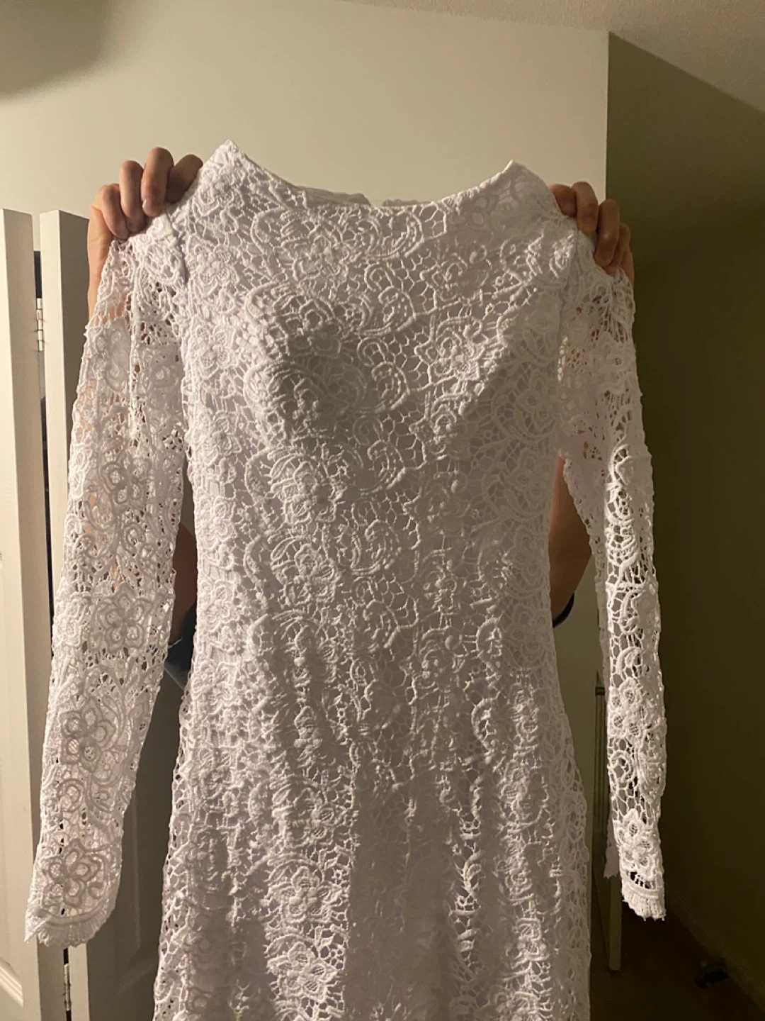 Tried only once and never worn Colour: White Size: 2 Bust (Inch): 32.5 Waist (Inch): 25.5 Hips (Inch): 35.75 Hollow To Floor (Inch): 58 Armhole (Inch): 15.4 Arm Length (Inch): 23.6 Arm Girth (Inch): 11.5 Must be ironed Pick up in the Laugheed mall area