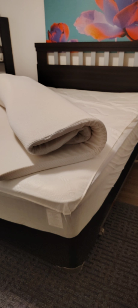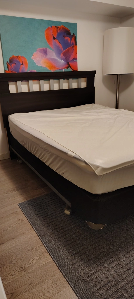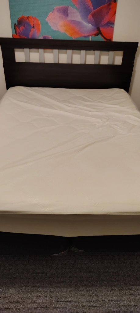 Selling a double bed includes mattress, metal base, headboard boxspring and mattress topper